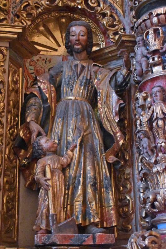San José, con vestido oscuro con estampados dorados y manto cuyo forro es dorado también, levanta la mano izquierda mientras con la derecha acaricia la cara de su Hijo, que de pie agarra el manto con una manita. La otra sostiene un hacha, cita al oficio de su padre.
