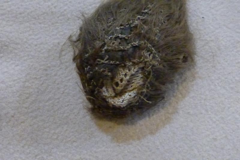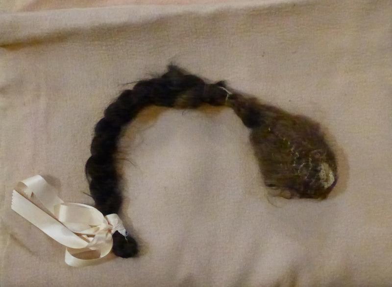 Trenza de pelo natural, seguramente femenina, cogida por un lazo blanco textil en su extremo, seguramente repuesto, con una redecilla de ganchillo para coser y fijar las hebras capilares para coser y fijar las hebras capilares.