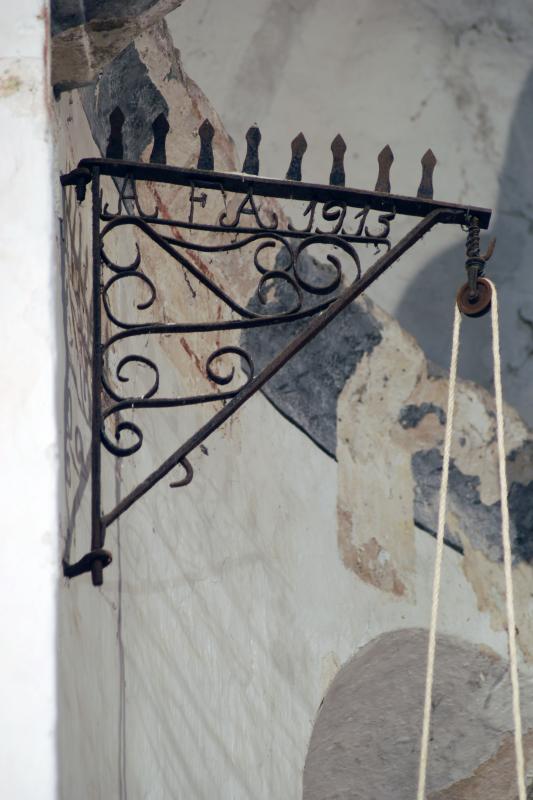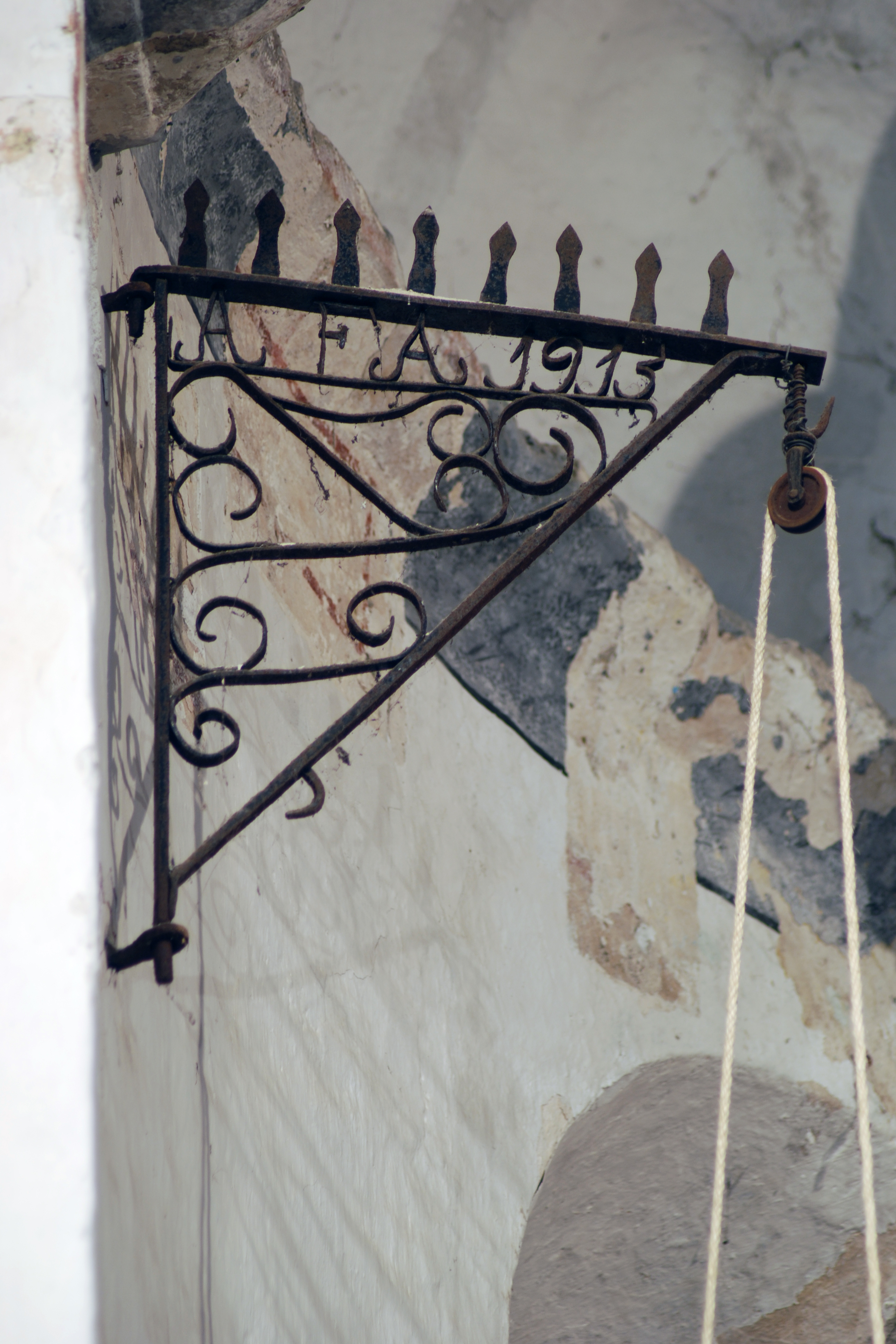 Roldana sostenida por una elaborada obra de forja con forma de triángulo compuesto de tres pletinas. La superior se festonea con ocho picos. El interior del triángulo se refuerza con estilizadas “eses” soldadas que lo calan, en cuya parte superior, también en forja, se inscribió: A F A[ño] 1913.