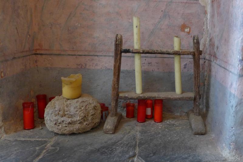 Sencillo bastidor compuesto de dos listones horizontales embutidos mediante vástagos a dos montantes verticales, apoyados estos en sendos pies donde se hincan. Tres orificios en el listón superior permiten insertar otros tantos cirios.
