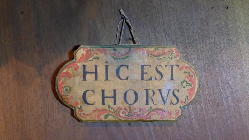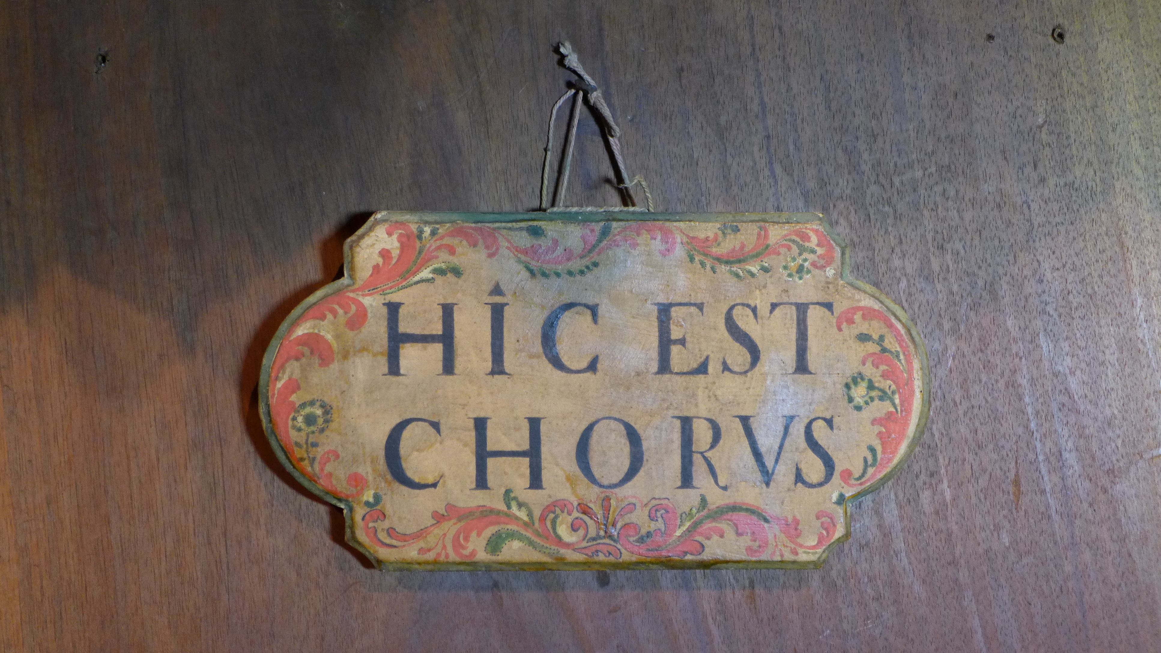 Cartela de madera con forma de tarja con una inscripción pintada en su interior: HIC EST CHORUS