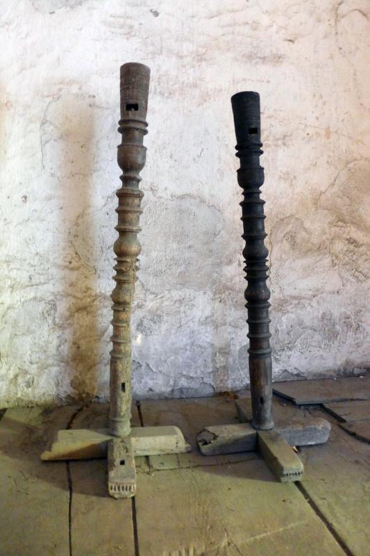 Dos hacheros con pie de cuatro patas rectas y vástago de una pieza torneado con molduras con los típicos y listeles achaflanados alternando con bulbos en distintas secuencias. En la parte superior, se colocaba el hacha de cera.