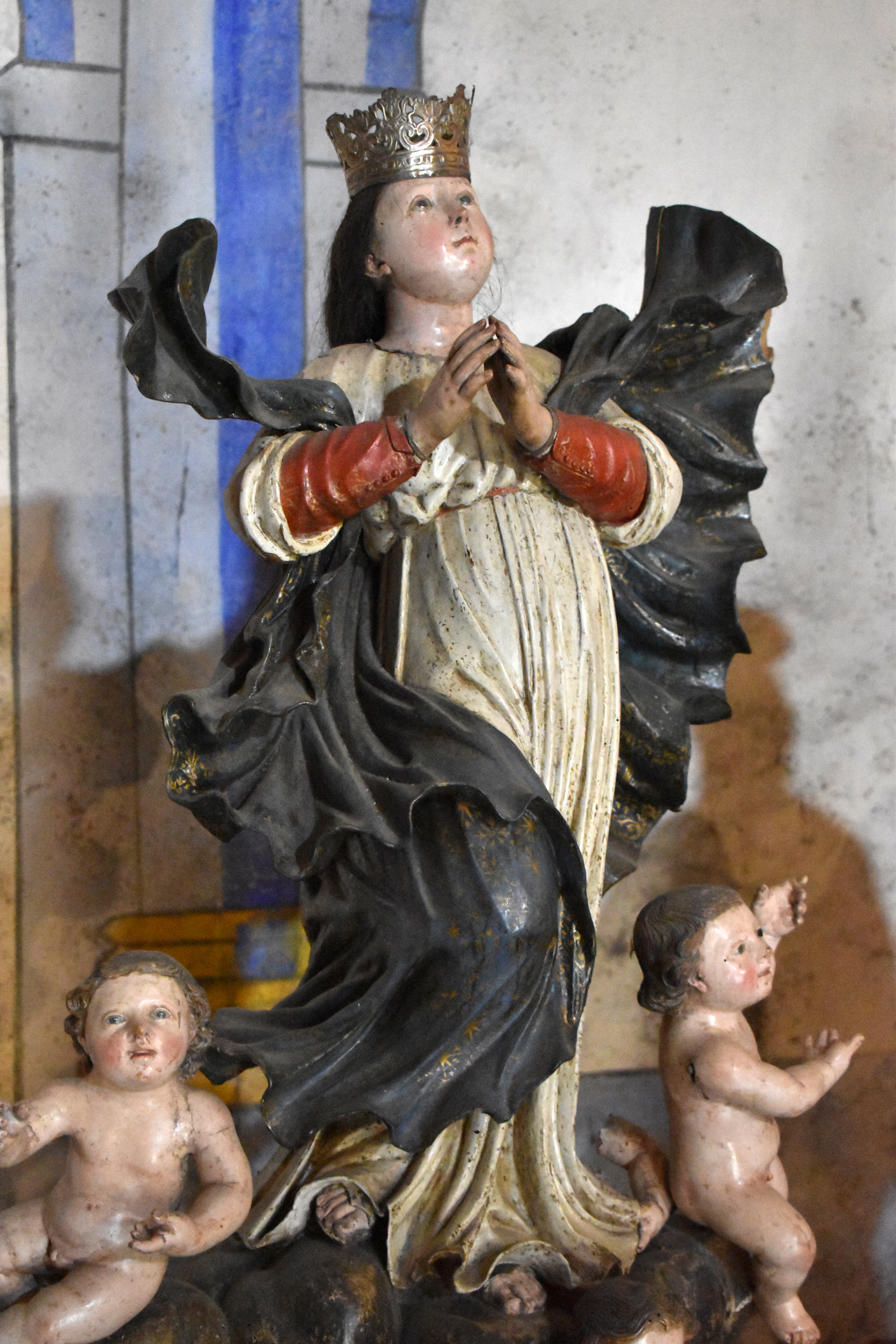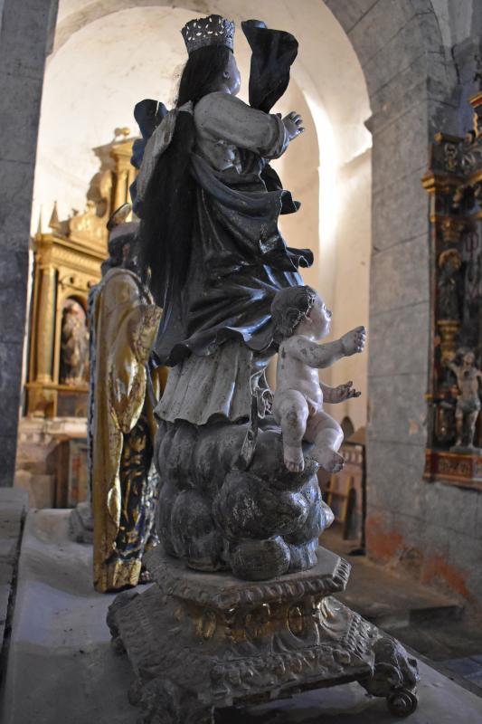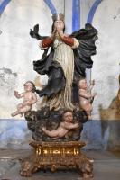 María se presenta sobre un generoso nubaje de estructura troncocónica y formas bulbosas en que se insertan tres angelitos de cuerpo entero, uno en el centro, y dos sentados en el extremo superior de tal conjunto de nubes. Todo el conjunto se apoya en una peana dorada con molduras y cuatro pies con sendas cabecitas en cada uno.