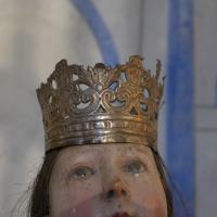 Virgen presentada de pie, con la cabeza mirando hacia arriba y manos en posición de oración. Porta camisa roja, vestido blanco, cordón rojo a modo de cinturón, y voladísimo manto azul con estrellados estampados dorados, de ostentosos pliegues al aire. Flexiona levemente su pierna derecha en delicado escorzo, y asoman por debajo del vestido la punta de sus pies, calzados con sandalias. La talla porta corona metálica, pelo natural y ojos de cristal.