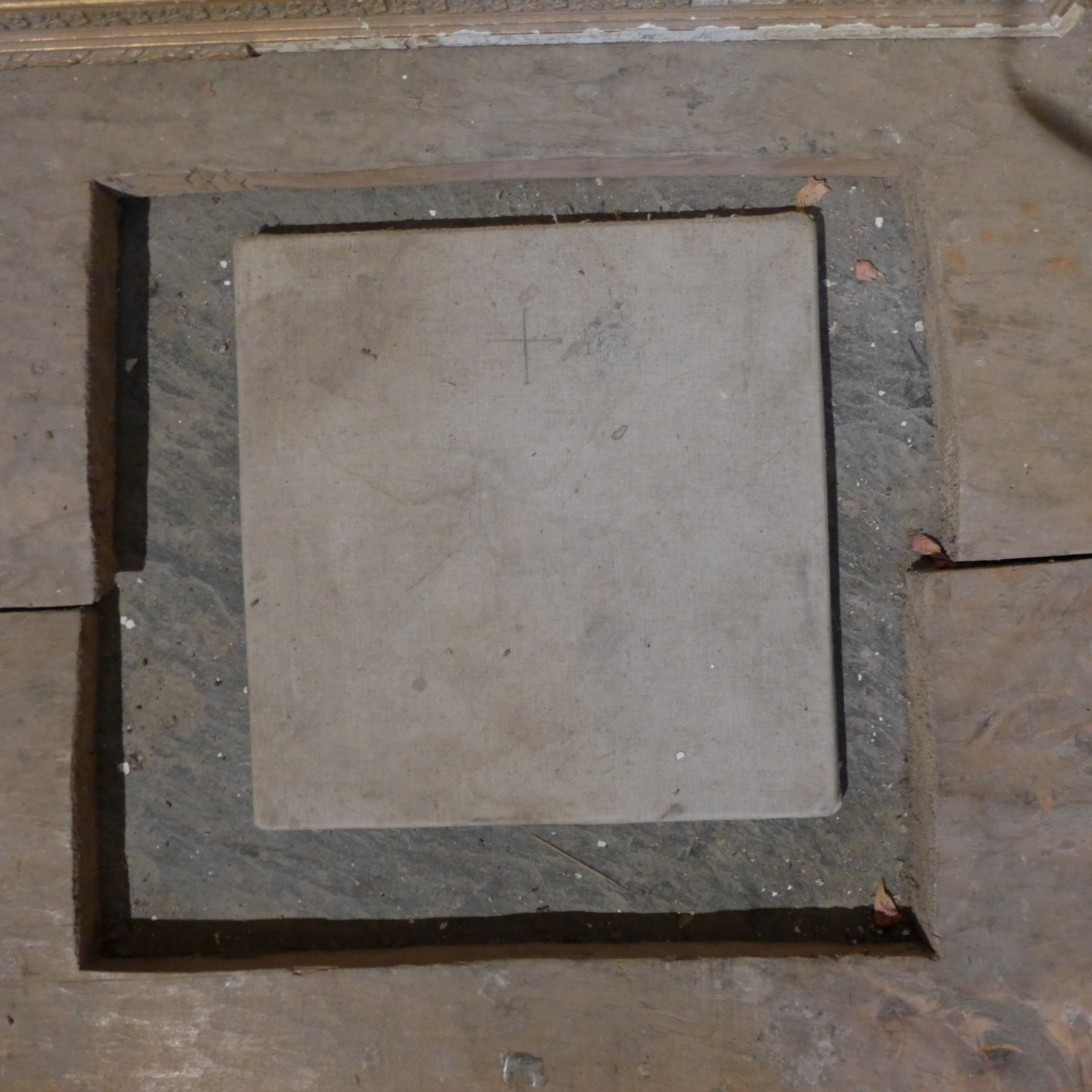 Está forrado con lienzo, en que se ha dibujado a lápiz una cruz.