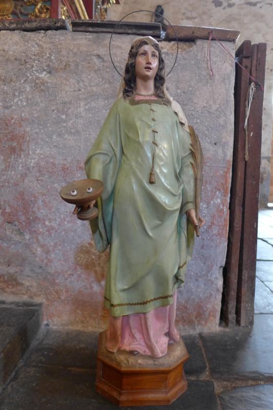 Figura de escayola con la santa de pie, nimbada (con aro de metal), con vestido rosa y túnica verde, que sostiene en una mano la palma del martirio y en la otra una copa tipo kylix con los dos ojos como símbolo parlante.