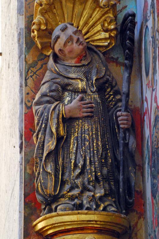 Monje benedictino de amplia tonsura presentado de pie, con mirada hacia arriba y cabeza girada enmarcada por una gran venera dorada dispuesta detrás de ella. Muestra su cuello degollado, con visible tajo y sangre. Viste hábito negro con estofados geométricos, capillo hacia atrás. Porta palma del martirio en la mano izquierda y apoya la derecha sobre su vientre.