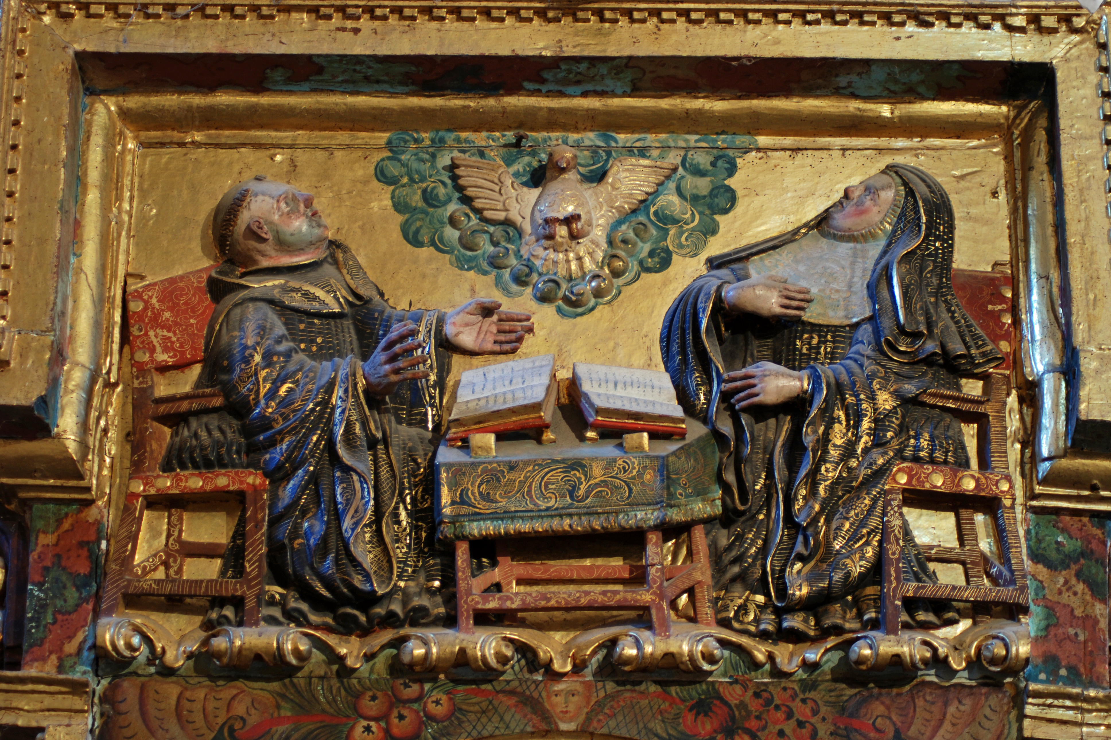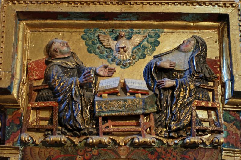 Representa a un monje (a la izquierda según se mira) y una monja (a la derecha) con hábitos benedictinos, sentados en sendos sillones fraileros ante una mesa baja que se interpone entre los dos donde leen sus respectivos libros apoyados en atriles. Los dos, sobresaltados, miran hacia arriba, donde el Espíritu Santo se aparece en forma de paloma entre un rompimiento de gloria. La parte inferior de la tabla se adorna con cueros recortados en relieve