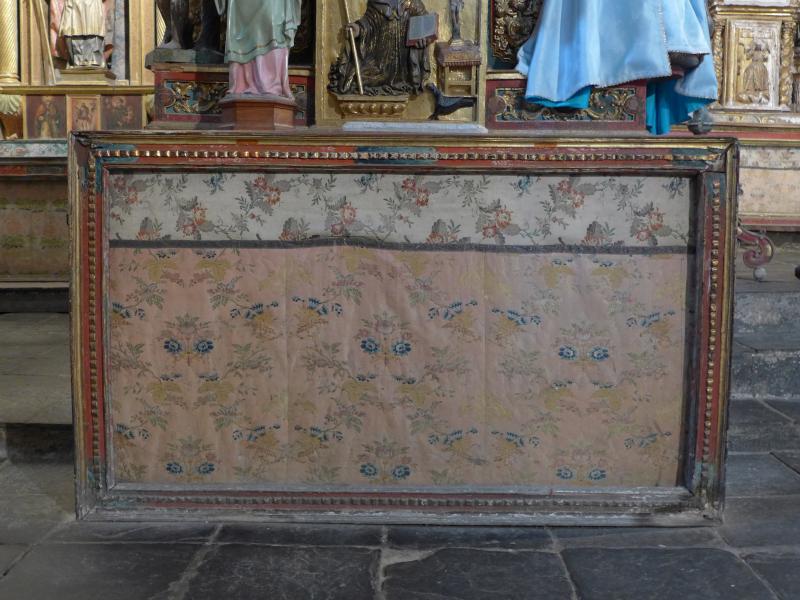 Frontal de lienzo con su marco. El frontal está compuesto de varios retales cosidos de dos telas distintas. Los tejidos se adornan con motivos florales grises y anaranjados en la tela superior y azules, amarillos y grises en la inferior. El frontal se conserva con su marco de madera, dorado y policromado en su frente en rojo (menos las esquinas, en azul).