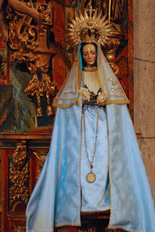 Estructura vestidera con faz y manos vistas, cubierta por camisa blanca y vestido y manto azul. La cabeza, con corona metálica, se cubre con toca de tul, y porta un rosario con un medallón de cera.