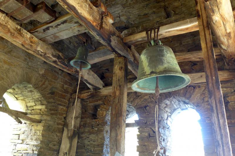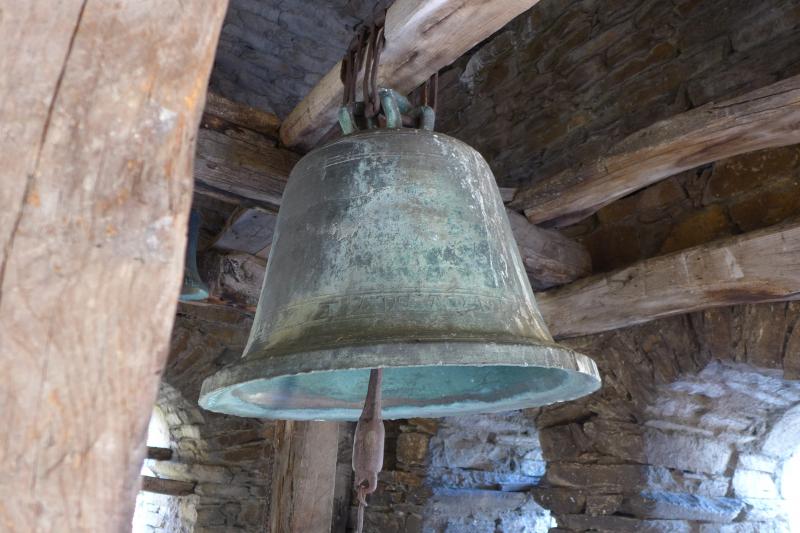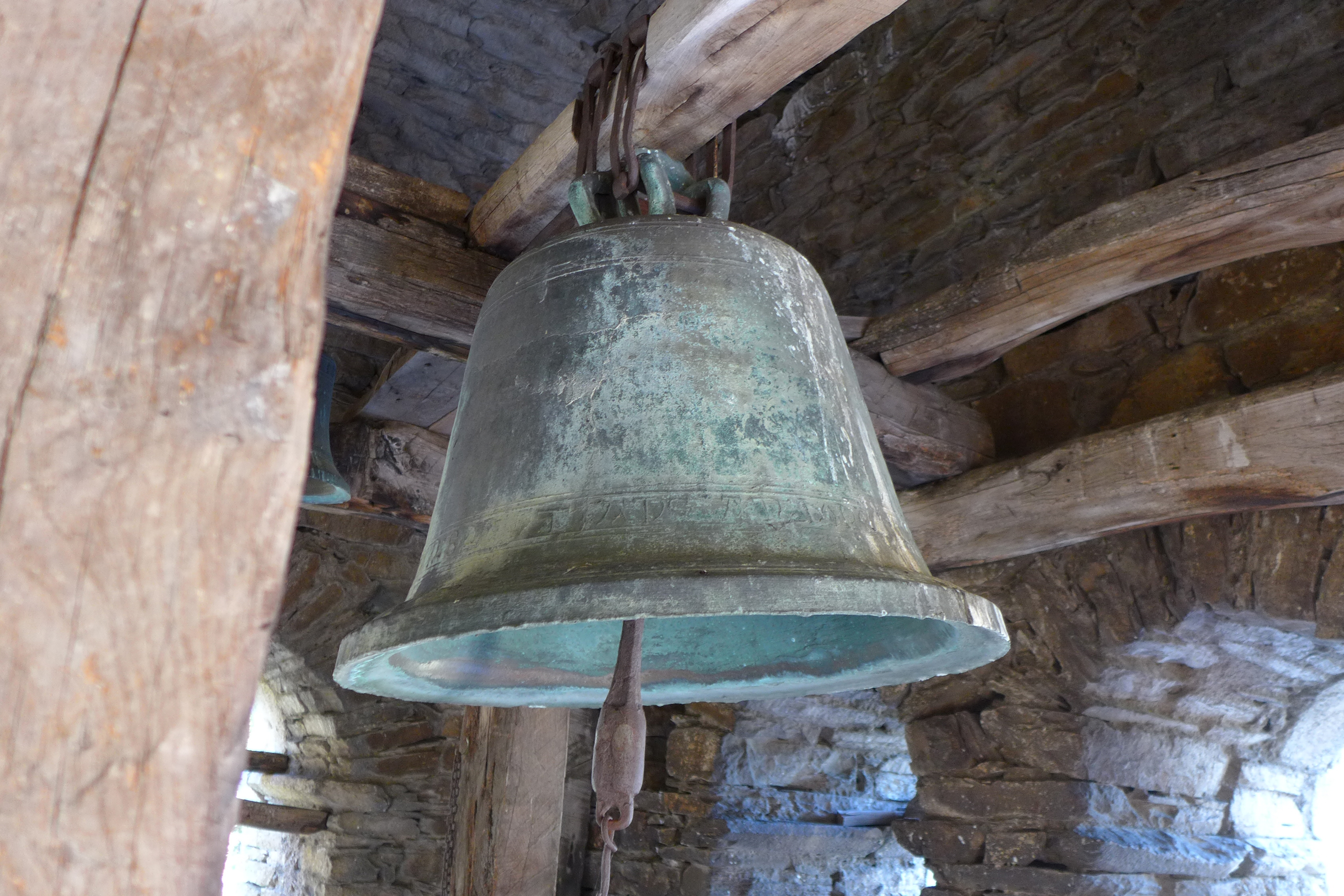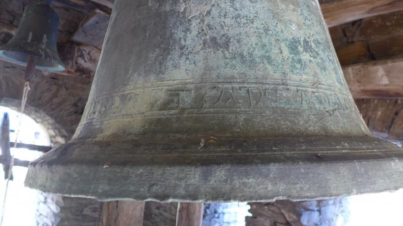 Campana de perfil romano de gran tamaño. Su tercio lo decoran dos parejas de cordones, así como su pie, que contiene una inscripción. Conserva el badajo.