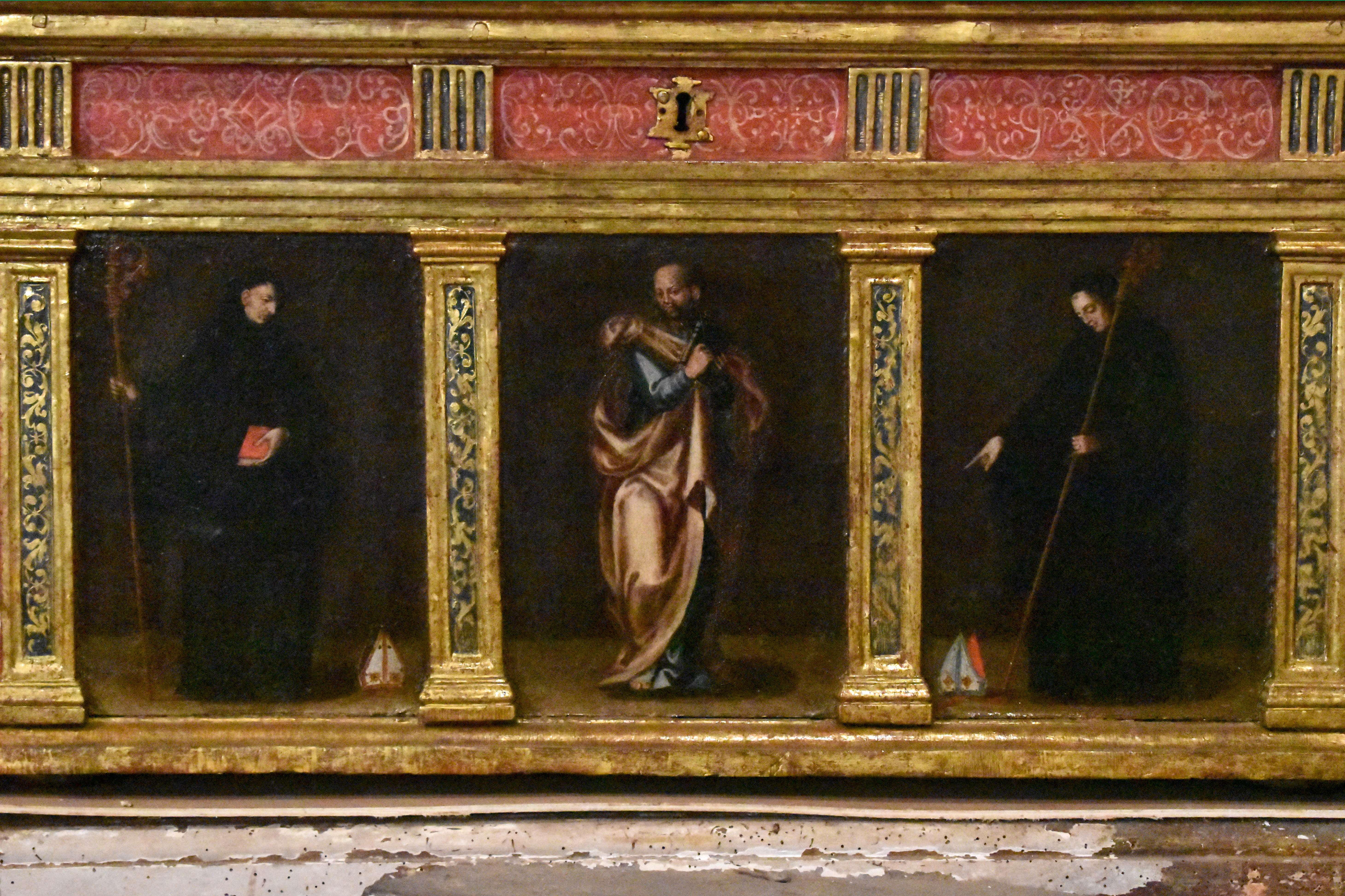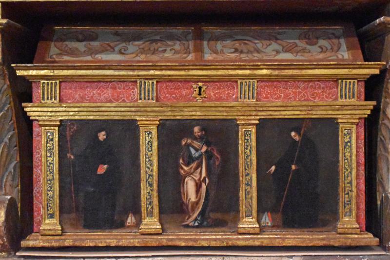 Arca compuesta de caja prismática y tapa cierre de perfil triangular. El frente del arca se articula en dos espacios, el inferior, que ocupa tres cuartas partes y acoge la iconografía, y uno superior, a modo de arquitrabe. En la parte anterior, con estructura tetrástila marcada por pilastrillas con sus frentes estofados, se observan tres tablas representando a otros tantos personajes, todos de pie. La central corresponde a San Pablo, con vestido azul y manto anaranjado y que sostiene un libro cerrado entre ambas manos, al que flanquean dos benedictinos barbilampiños. El de su derecha (según se mira el arca) es un abad: dispone una mitra abacial en el suelo, y parece señalarla con su mano derecha. Con la izquierda sostiene un báculo. Similar actitud observa el santo de la izquierda, con el añadido de un libro cerrado en la mano izquierda.