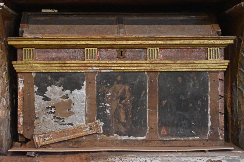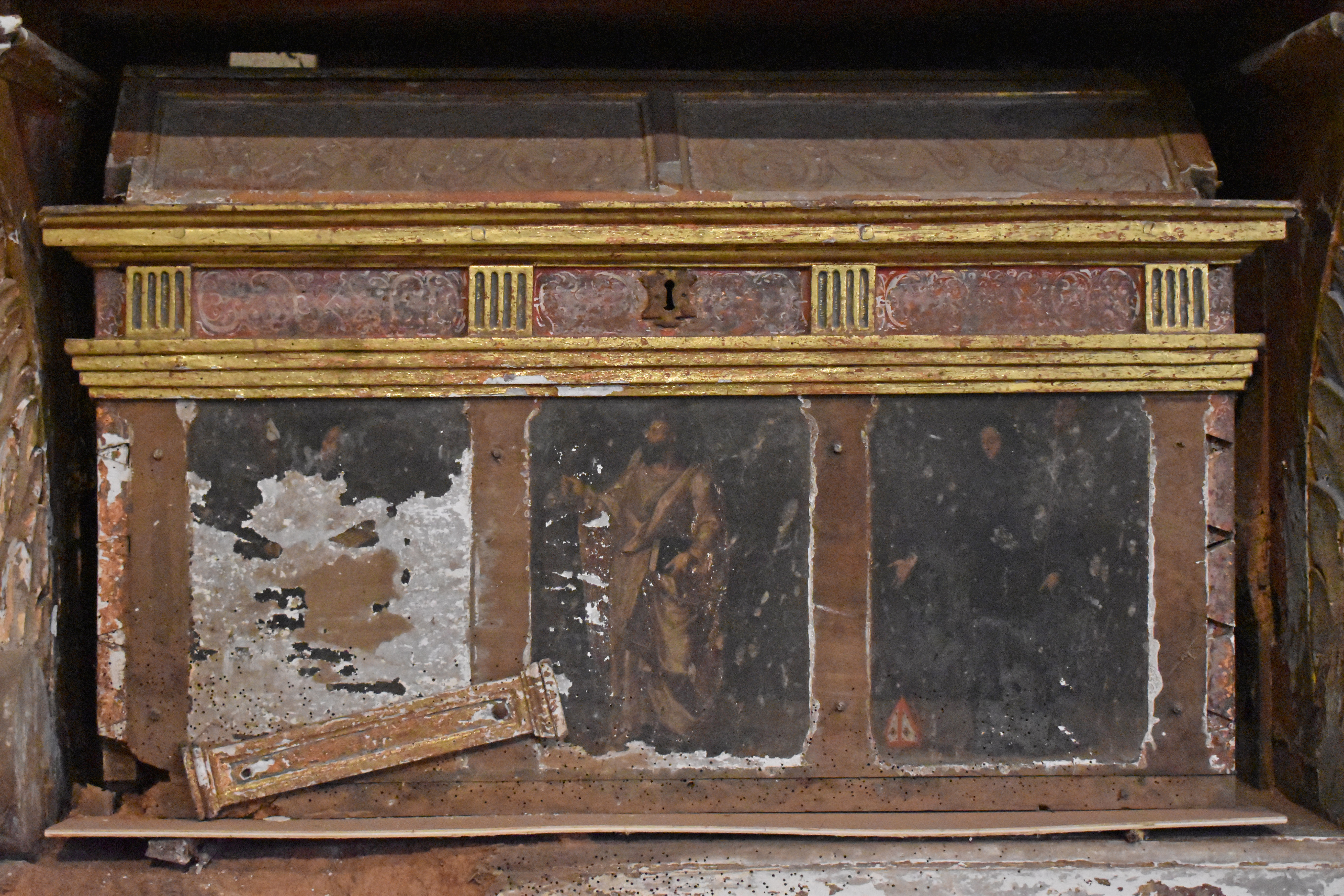 Arca compuesta de caja prismática y tapa cierre de perfil triangular. El frente del arca se articula en dos espacios, el inferior, que ocupa tres cuartas partes y acoge la iconografía, y uno superior, a modo de arquitrabe. En la parte anterior, con estructura tetrástila marcada por pilastrillas (hoy perdidas, salvo una, descolgada), se observan tres tablas representando a otros tantos personajes, todos de pie. La central corresponde a San Pedro con sus llaves en una mano y un libro cerrado en la otra, con vestido y manto, girado hacia un lado, al que flanquean dos benedictinos. El de su derecha (según se mira el arca) es un abad barbilampiño: dispone una mitra abacial en el suelo, y parece señalarla con su mano derecha. Con la izquierda sostiene un báculo. Es más difícil describir la escena del santo de la izquierda, por el estado de conservación de la tabla. Parece un benedictino barbado que mira hacia el suelo.