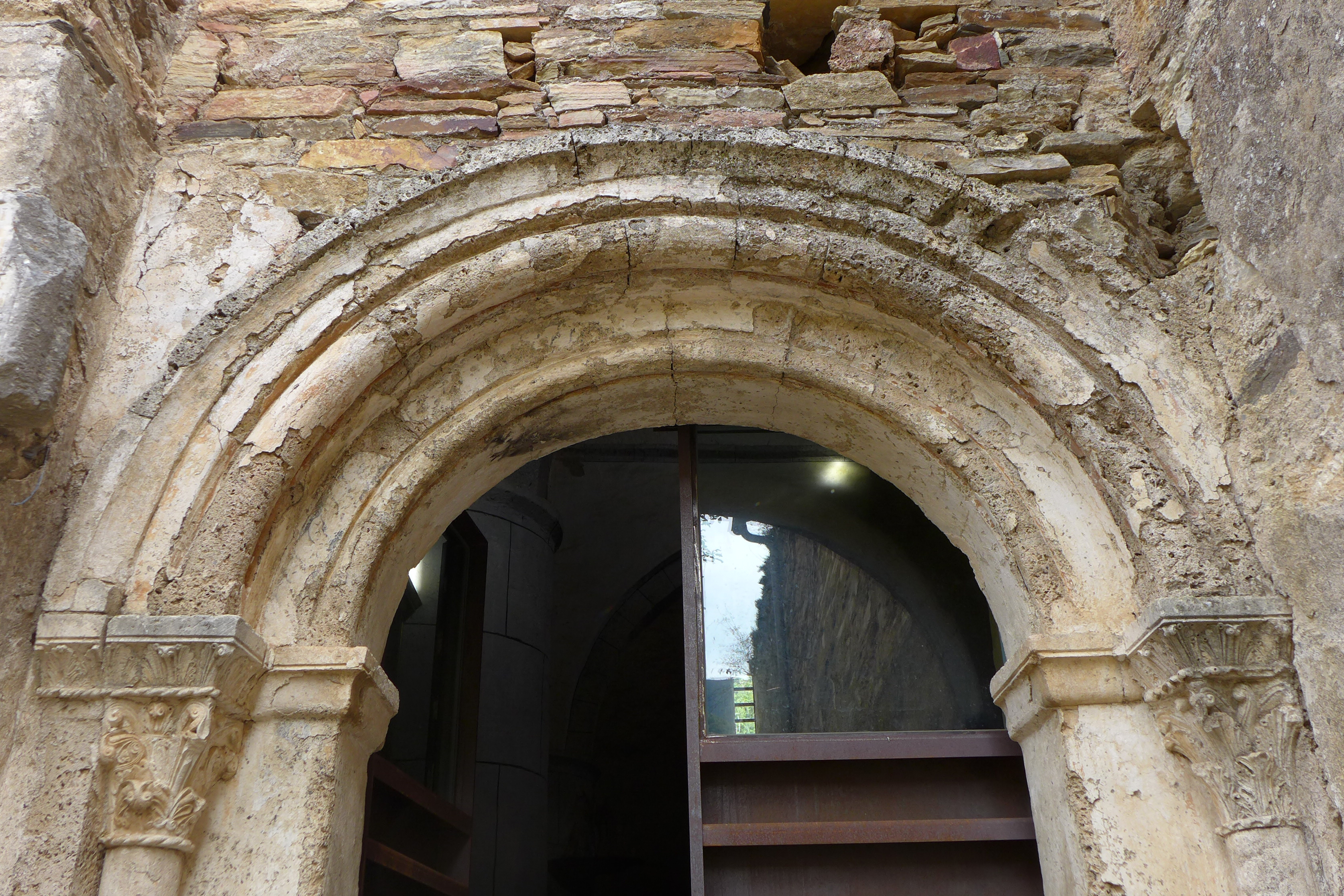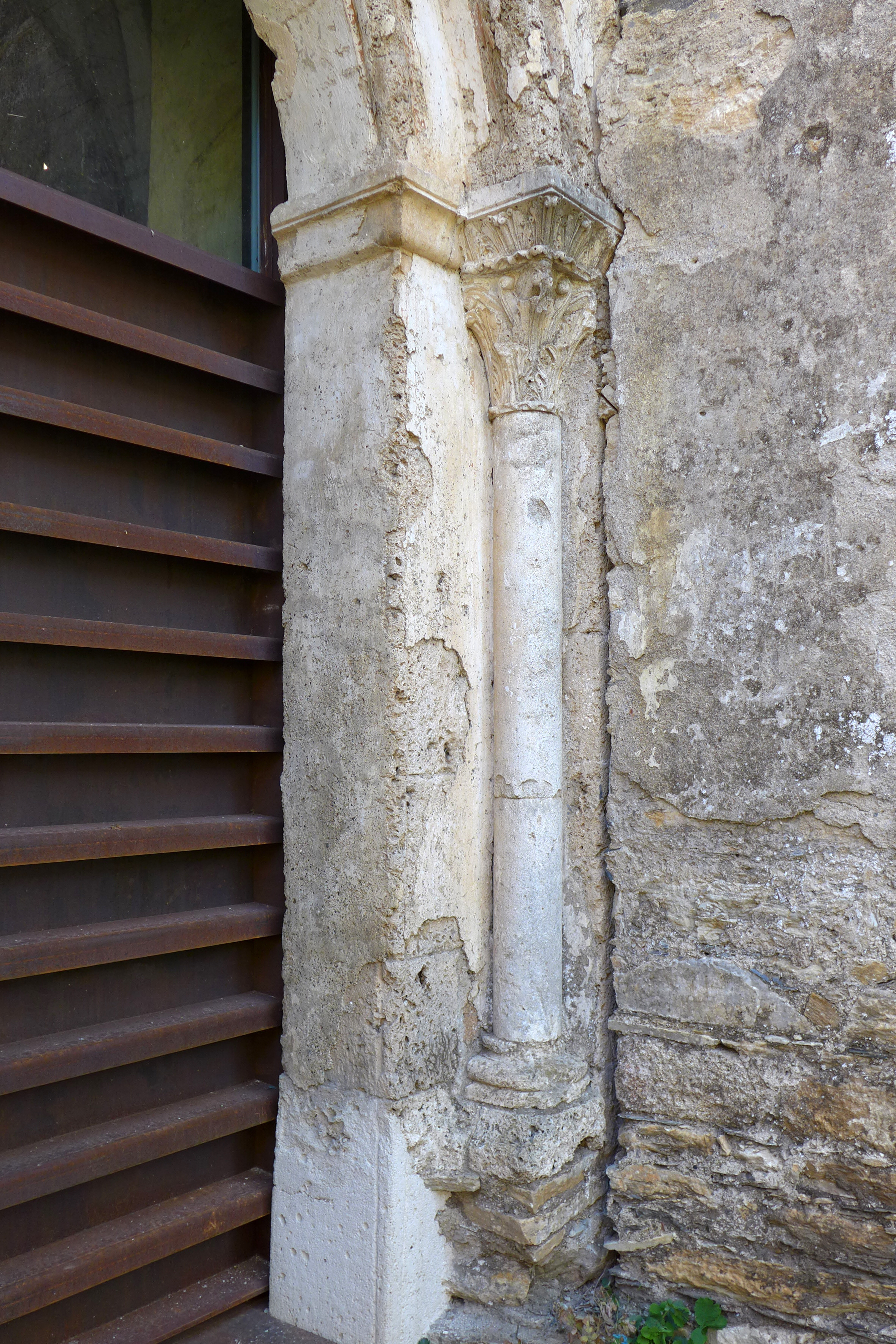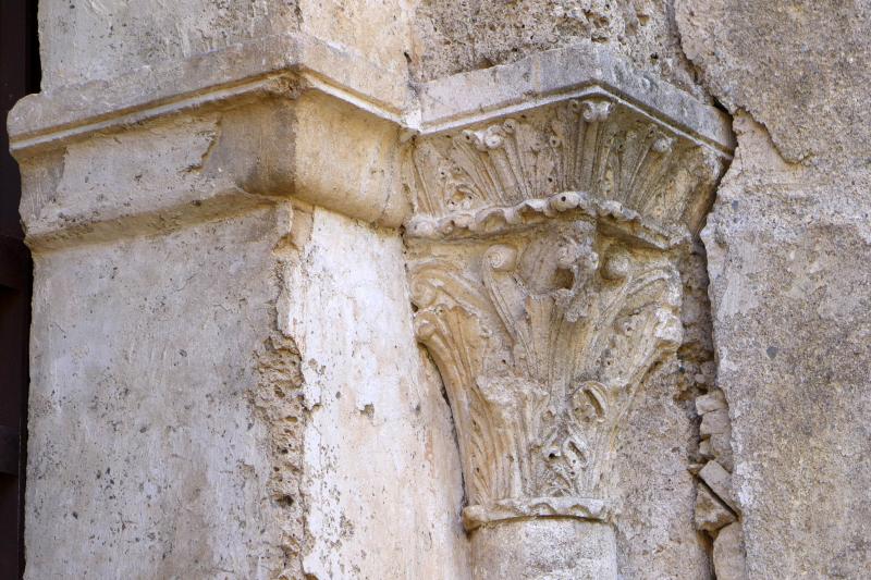 Capitel de columna acodillada entre pilastras de fuste liso (compuesto de dos tambores) sobre basa con plinto. Voltea sobre él un arco de medio punto. Se decora con estilizadas hojas de acanto de fina labra. El cimacio, sobre listel y astrágalo también vegetal, continúa la misma decoración que la cesta y remata en un prisma liso.