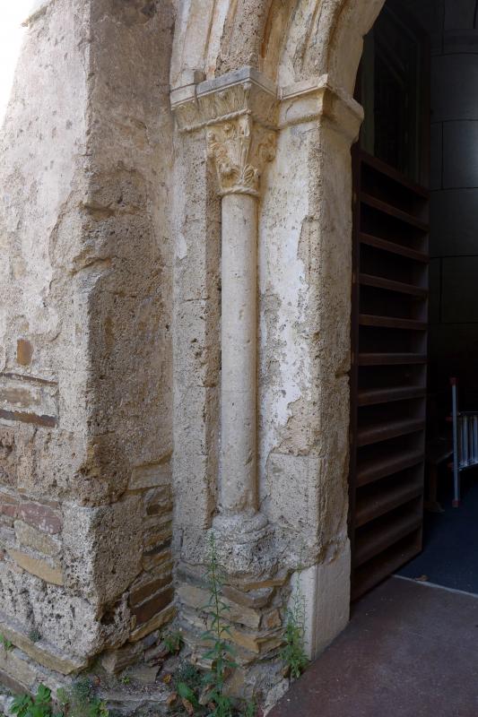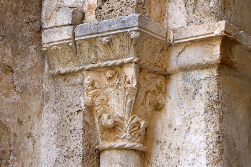 Capitel de columna acodillada entre pilastras de fuste liso (compuesto de dos tambores) sobre basa con plinto. Voltea sobre él un arco de medio punto. Se decora con estilizadas hojas de acanto de fina labra y nervio en su esquina. El cimacio, sobre listel y astrágalo sogueado, continúa la decoración vegetal de la cesta y remata en un prisma liso.