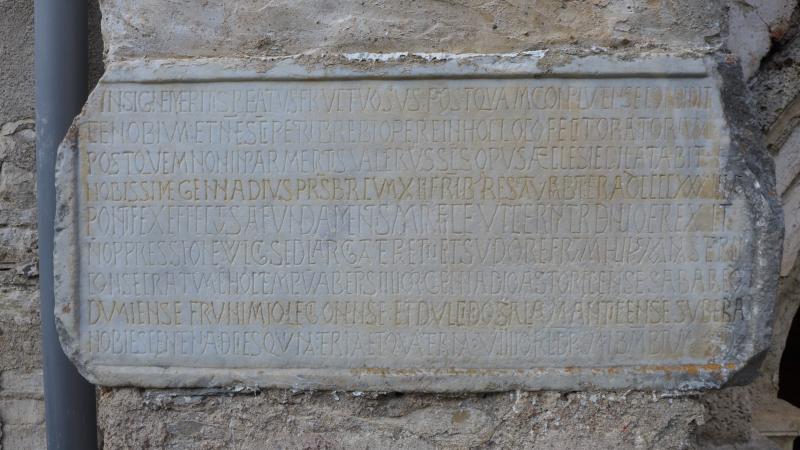 INSIGNE MERITUS BEATUS FRUCTUOSUS POSTQUAM COMPLUTENSE CONDIDIT CENOBIUM ET NOMINE SANCTI PETRI BREVI OPERE IN HOC LOCO FECIT ORATORIUM POST QUEM NON INPAR MERITIS VALERIUS SANCTUS OPUS AECLESIAE DILATABIT NOBISSIME GENNADIUS PRESBITER CUM XII FRATRIBUS RESTAURABIT ERA DCCCCXXXIIIA PONTIFEX EFFECTUS A FUNDAMENTIS MIRIFICE UT CERNITUR DENUO EREXIT NON OPPRESIONE VULGI SED LARGITATE PRETII ET SUDORE FRATRUM HUIUS MONASTERII CONSECRATUM EST HOC TEMPLUM AB EPISCOPIS IIIIOR GENNADIO ASTORICENSE SABARICO DUMIENSE FRUNIMIO LEGIONENSE ET DULCIDIO SALMANTICENSE SUB ERA NOBIES CENTENA DECIES QUINA TERNA ET QUATERNA VIIIIº KALENDARUM NOBEMBRUM