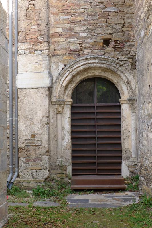 Placa de mármol con espejo epigráfico rehundido y listel perimetral liso con una inscripción en nueve líneas y letra visigótica que explica los orígenes del monasterio y establece su memoria desde la fundación por san Fructuoso, la renovación de san Valerio y la reconstrucción final por san Genadio. Conmemora la consagración de este último monasterio en presencia de cuatro obispos y se data en 24 de octubre de 919.