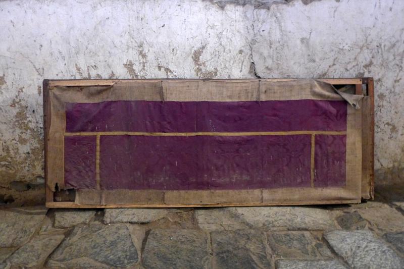 Frontal de lienzo morado adamascado, de una sola pieza cruzada por tres galones dorados (uno horizontal, dos verticales) que la dividen en cuatro espacios. Todo el frontal está cosido a una arpillera (que quedaría oculta por el marco, una vez instalado en su altar), clavada al bastidor de madera.