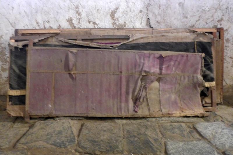 Frontal de lienzo morado adamascado, de una sola pieza cruzada por tres galones dorados (uno horizontal, dos verticales) que la dividen en cuatro espacios. Todo el frontal está cosido a una arpillera (que quedaría oculta por el marco, una vez instalado en su altar), clavada al bastidor de madera.
