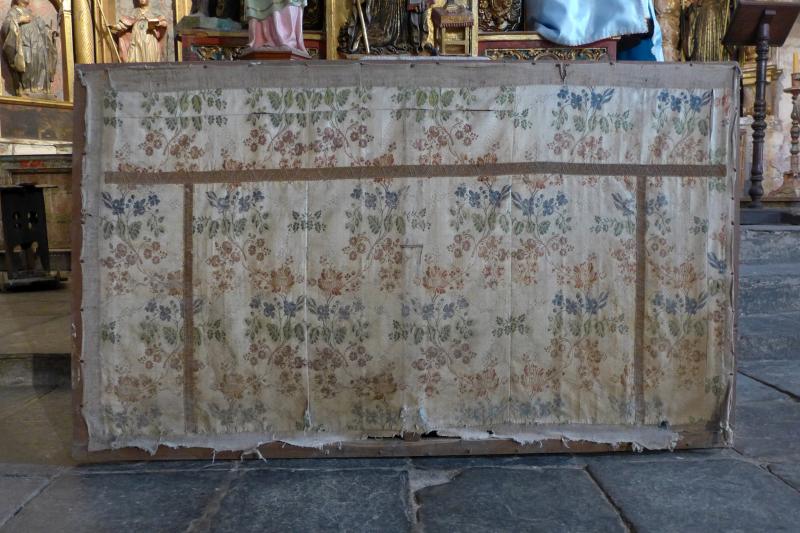 Frontal de lienzo, compuesto de cuatro retales cosidos formados por la misma tela, costuras ocultas por tres galones dorados (uno horizontal, dos verticales) que la dividen en cuatro espacios, siendo el central el que más espacio ocupa. El fondo de es de color crudo, y se adorna con flores rojas, verdes y azules bordadas. Todo el frontal está cosido a una arpillera (que quedaría oculta por el marco, una vez instalado en su altar), clavada a un bastidor de madera con cinco listones.