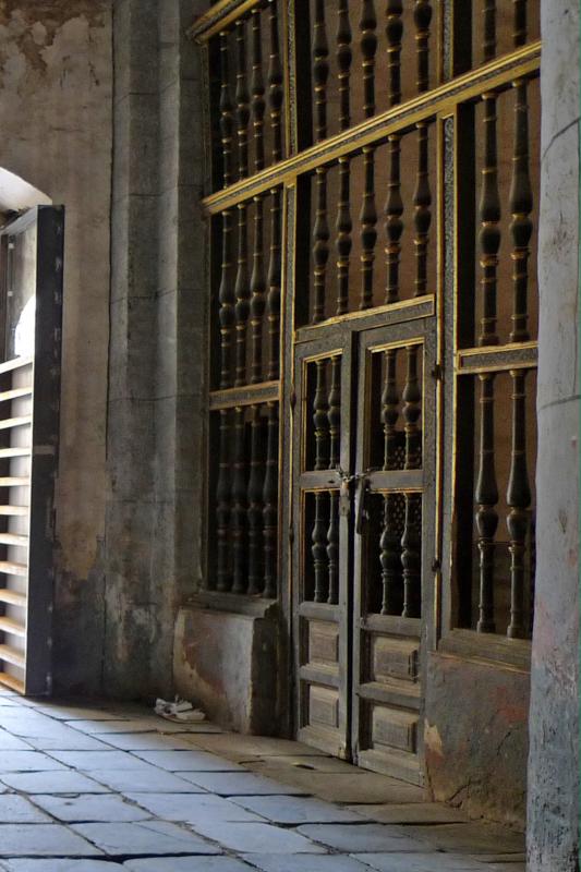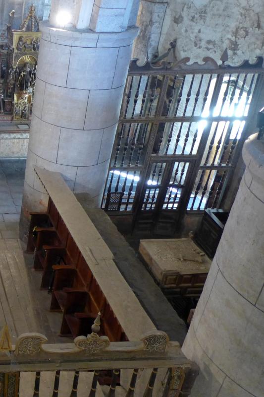 Las piezas arquitectónicas de madera exhiben sus frentes pintados de negro para que resalte un friso continuo de roleos seriados, dorándose tan solo los listeles de pilastrillas, entalles de los balaustres, y maderas de separación de módulos.