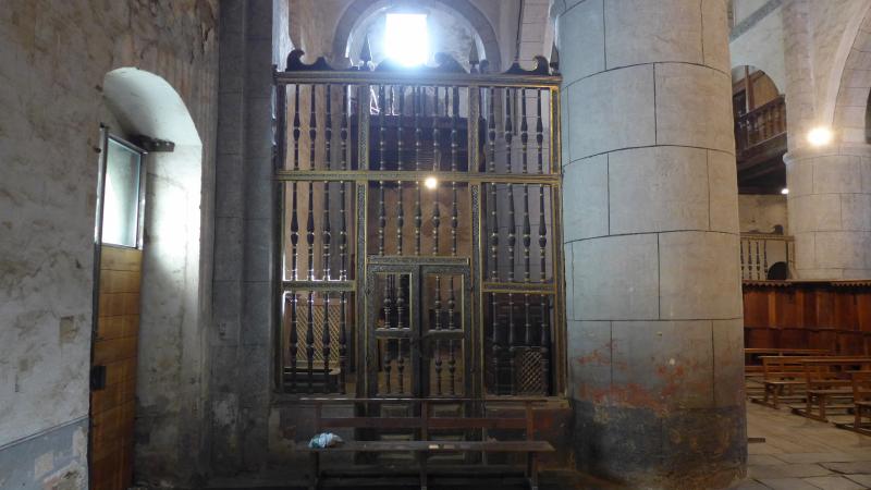 Reja de madera de tres calles y dos cuerpos más coronamiento. Los distintos módulos en altura y anchura se separan con pilastrillas. En su primera altura, las calles laterales se sitúan sobre pedestal de fábrica, y constan a su vez de dos alturas iguales. Las dos hojas batientes se sitúan en la parte central (cerrada con dos cuarterones por hoja hasta la altura de los pedestales), y sobre ellas un montante que llega hasta la primera altura del conjunto. La segunda altura superior mantiene, simplemente, la división de los cuerpos. Todos los huecos se cubren con balaustres torneados, cuatro en los cuerpos laterales y cinco en el central. Un sencillo coronamiento de perfil moldurado completa el cerramiento, pues carece de friso y entablamento, con dos pináculos de madera sobre las pilastrillas centrales y dos secundarios sobre las propias molduras.