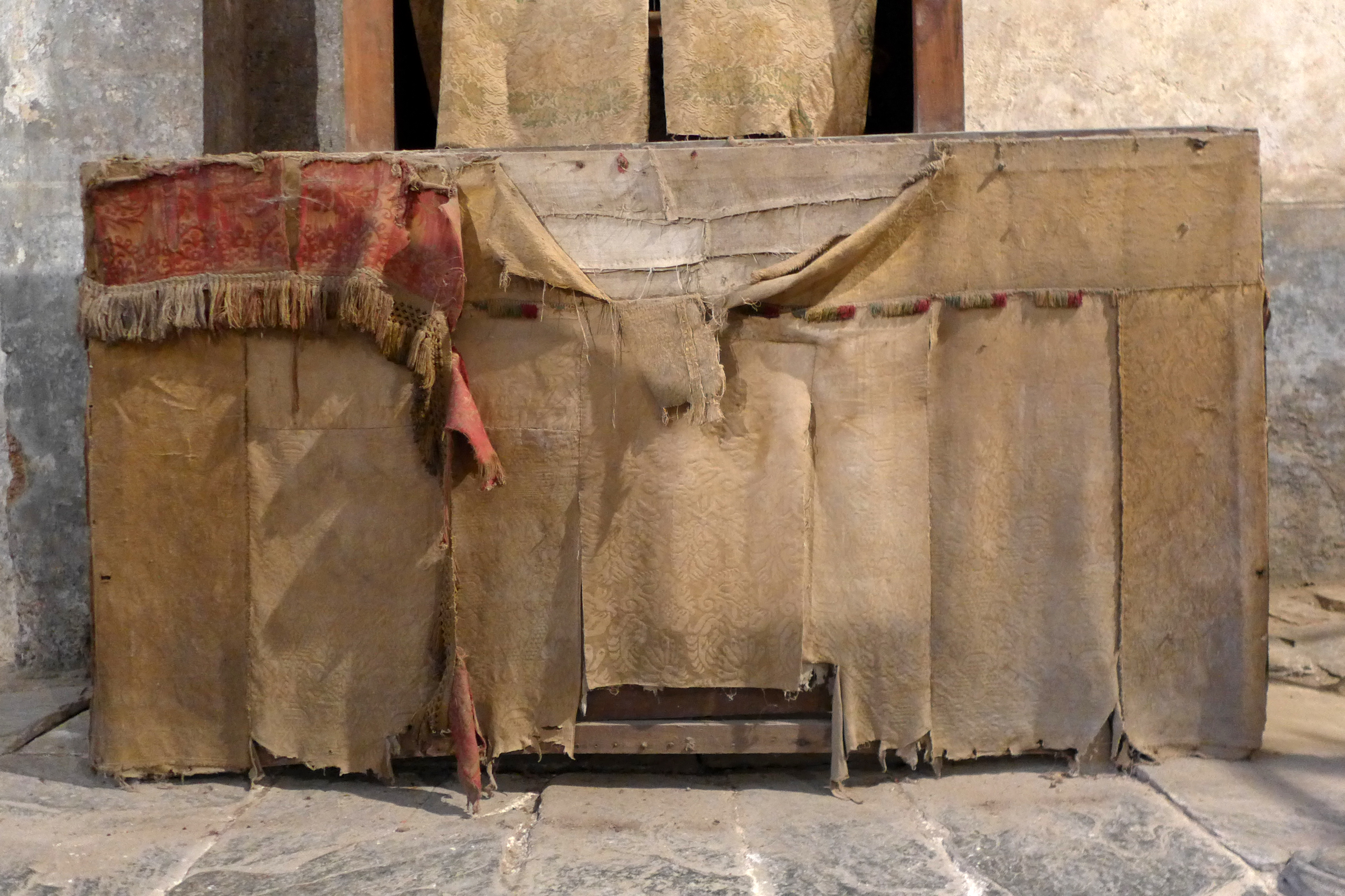 Restos de un frontal textil del que apenas resta el forro y fragmentos de la parte superior, compuesto de un damasco rojo con galón y flecos de hilos de colores.