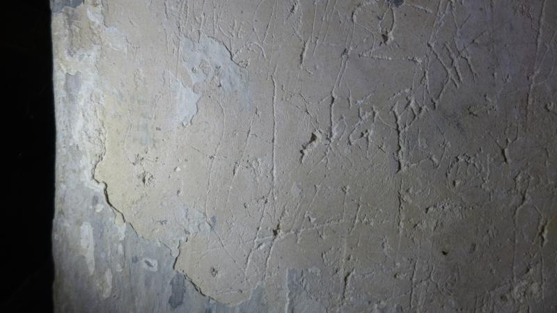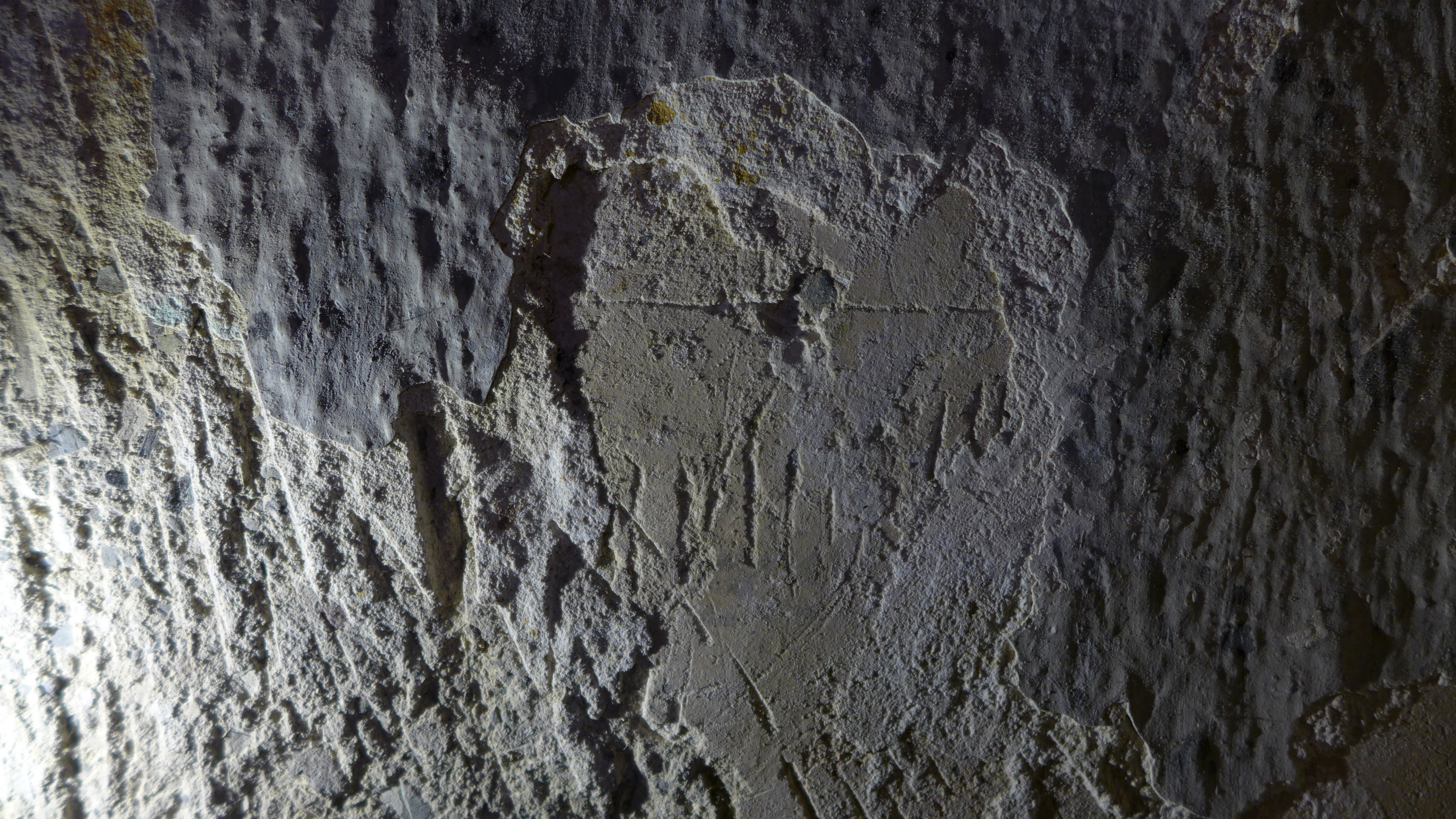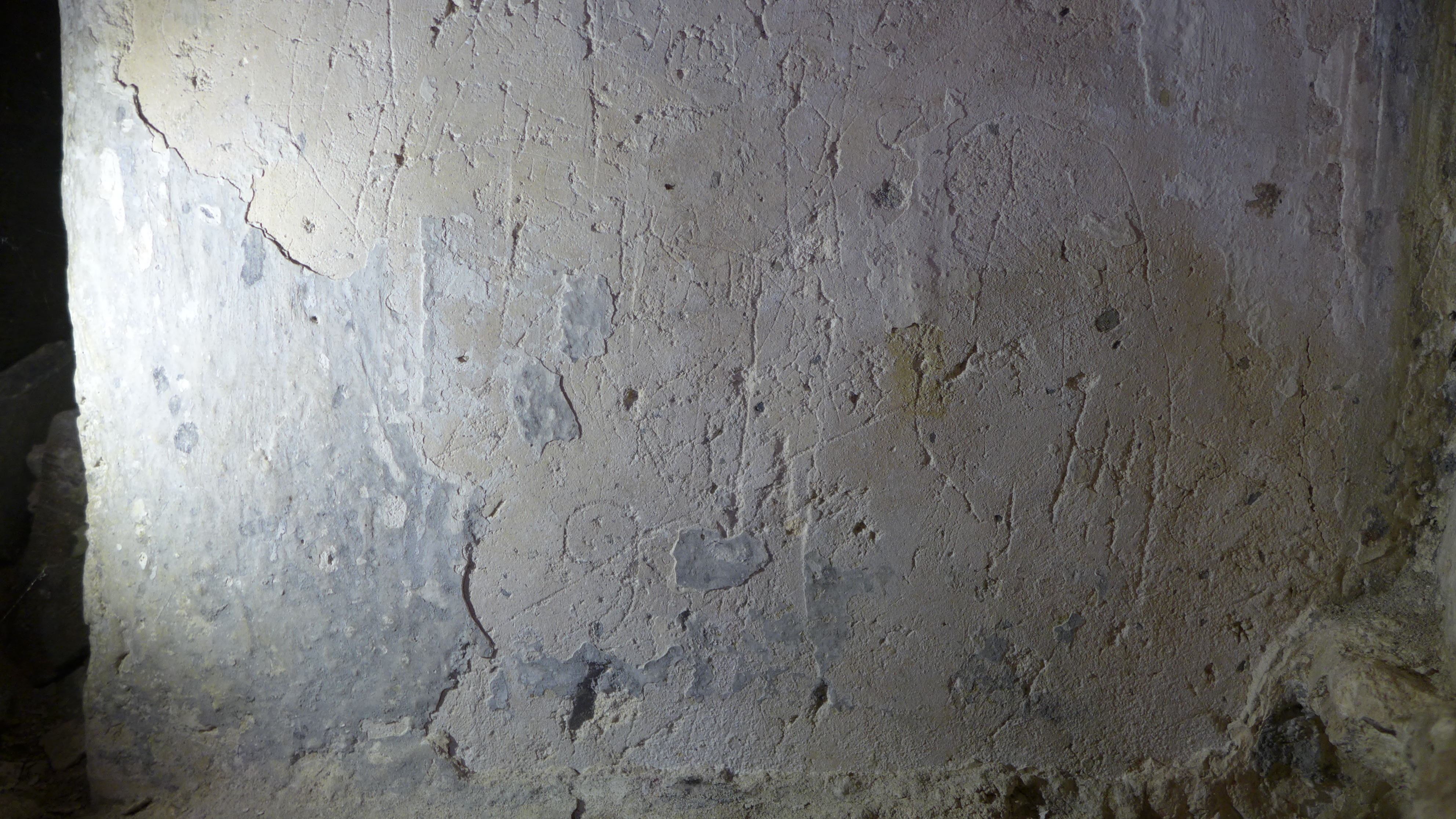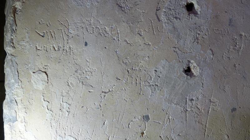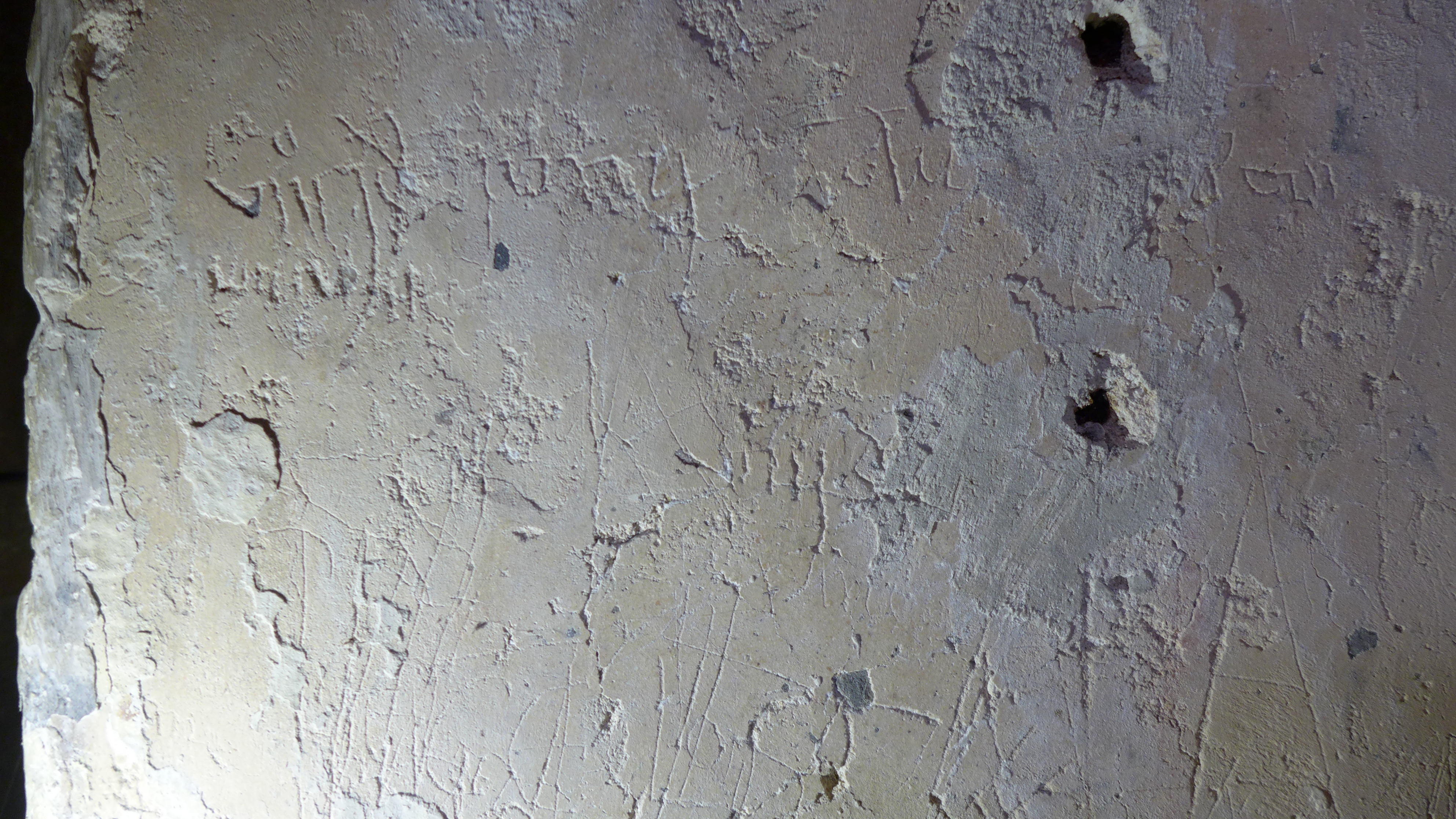 Inscripciones textuales grafiteadas (incisas) en varias alturas, con letra carolina. Una de ellas parece una datación, y en otras se observan numerales romanos.