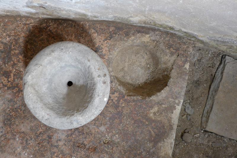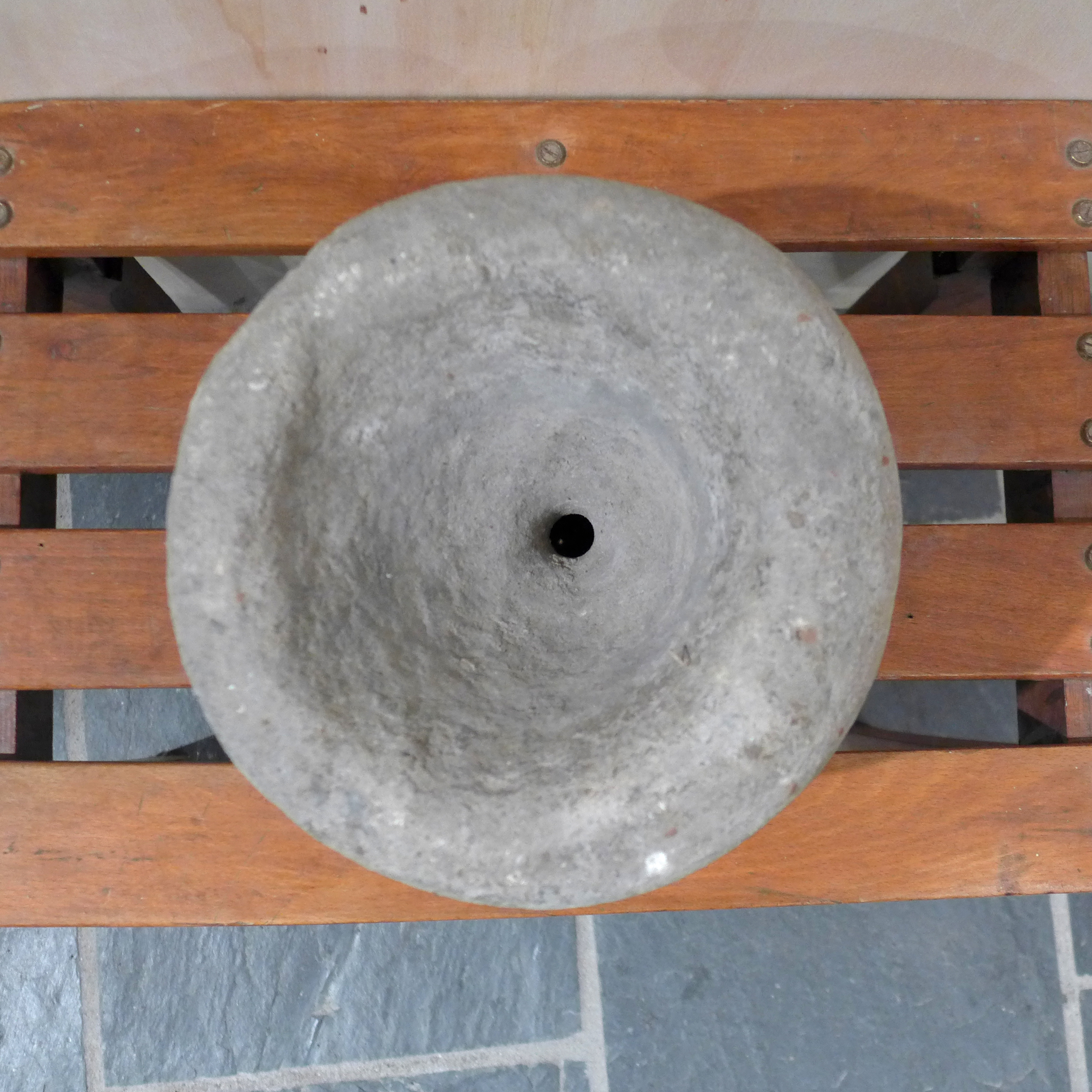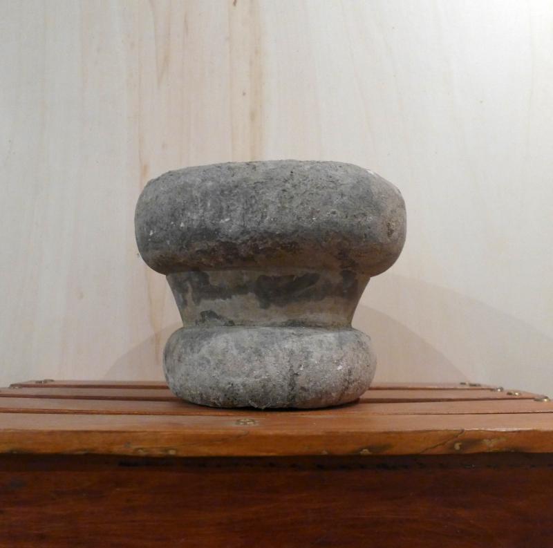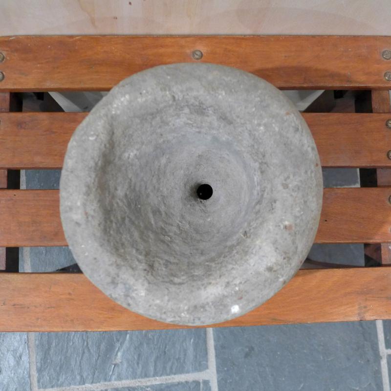 Pieza de planta circular, vaciada en su interior y con un agujero para evacuar líquidos en su parte central. Al exterior, dos gruesos rebordes circulares la ornan al exterior, en sus extremos superior e inferior.