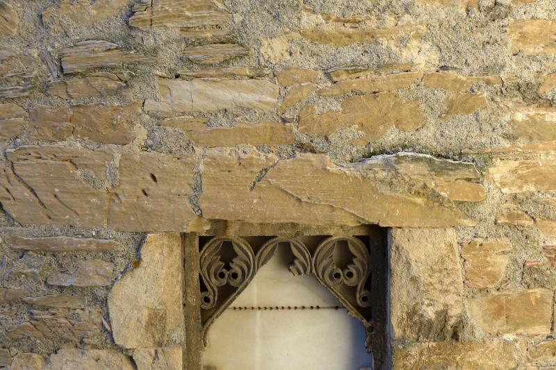 Los restos decorativos, insertos en un marco original ajustado a la altura de la ventana, muestran una decoración vegetal entrelazada y calada, trazada a bisel, de la que se conservan dos motivos simétricos en los extremos superiores de la pieza y parte de uno central. Apenas algunos fragmentos decorativos se reparten por otros lados de la pieza.