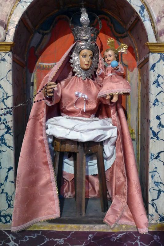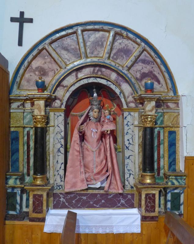 Retablo hornacina advocado a la Virgen del Rosario. Se compone de arco de medio punto con casetones soportado por pilastras cajeadas. La hornacina central, con arco doblado también de medio punto, va flanqueada por dos columnillas de capitel corintio y cimacio prismático. Este juego de soportes imprime al retablo un interesante juego de entrantes y salientes. En la hornacina central, delante de un fondo de cortinajes, se dispone la Virgen del Rosario, imagen vestidera. Toda la estructura y sus escasos elementos decorativos van marmoleados, acorde a los gustos del siglo XIX.