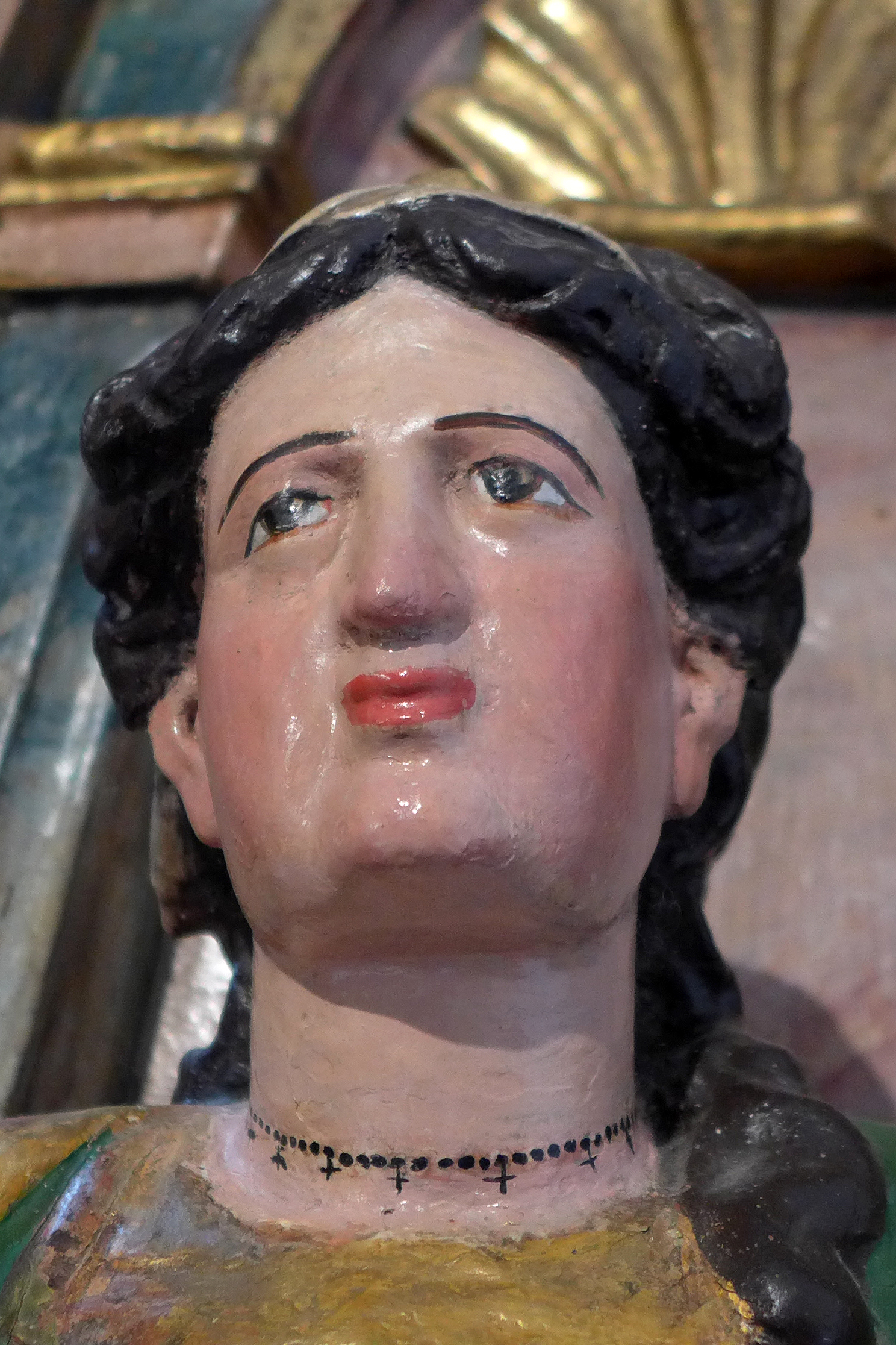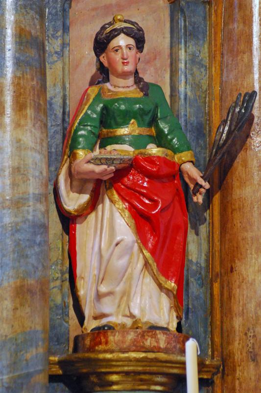Talla de una de las santas intercesoras por antonomasia, Santa Lucía. Se puede adscribir a la corriente romanista, dado lo ampuloso de sus paños, lo hierático de su postura o lo inexpresivo de su rostro, siempre dentro de una buscada monumentalidad. Viste camisa ceñida a la cintura, túnica por debajo y manto que cae desde su hombre derecho y se enreda por la cintura hasta recogerse en su regazo. Aquí se dispone, precisamente, su mano derecha que sujeta un plato con unos ojos, atributo principal de la santa. En la otra mano sujeta la palma del martirio. Resulta característico de este momento, también, el elaborado peinado, de correcta labra y adorno. Se ha repintado modernamente , momento en el que se incluiría también el collar que luce en su cuello.