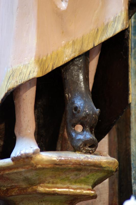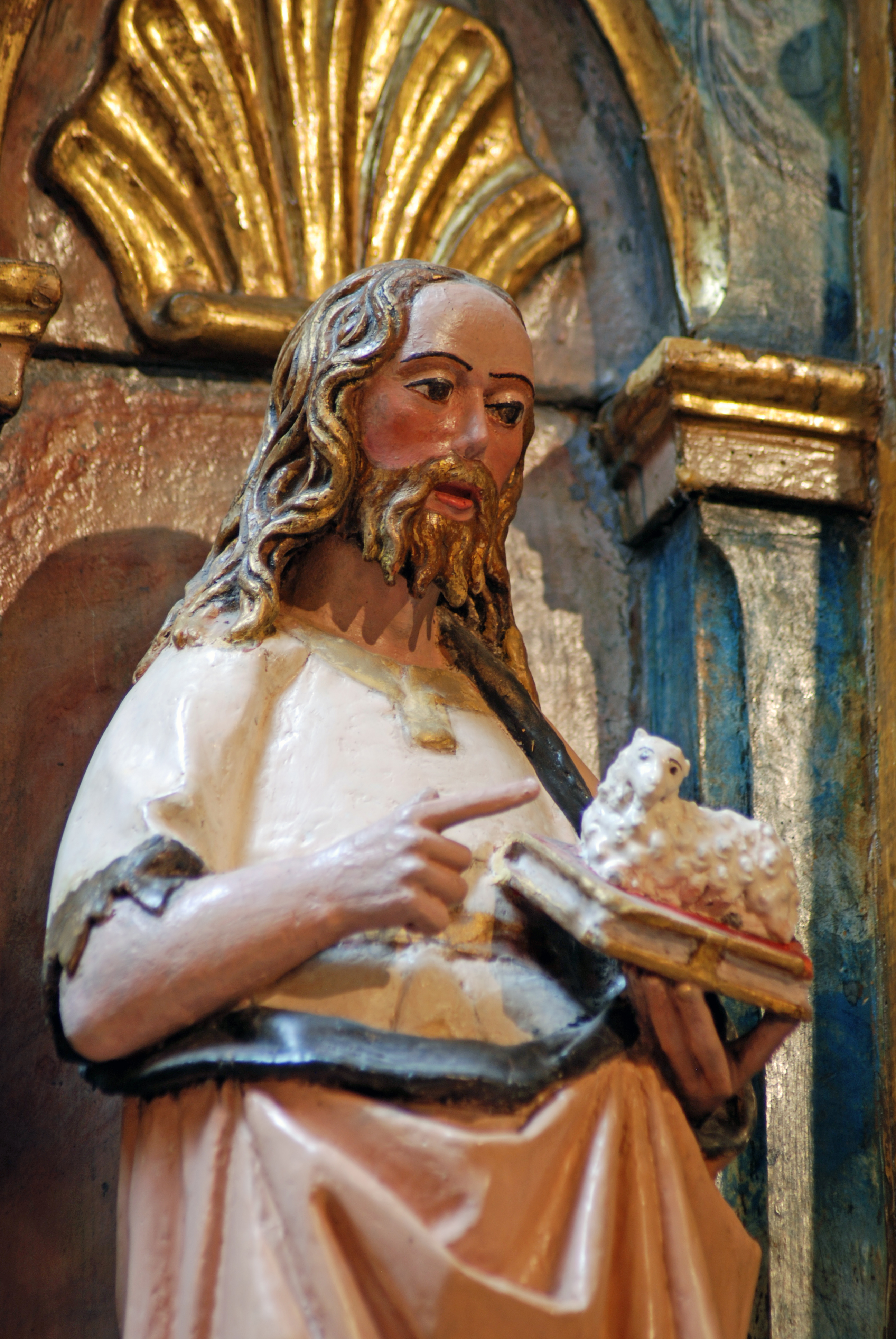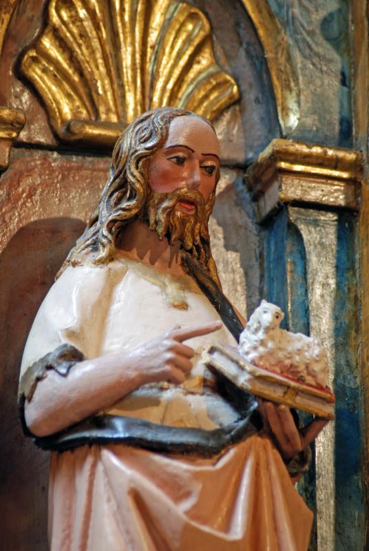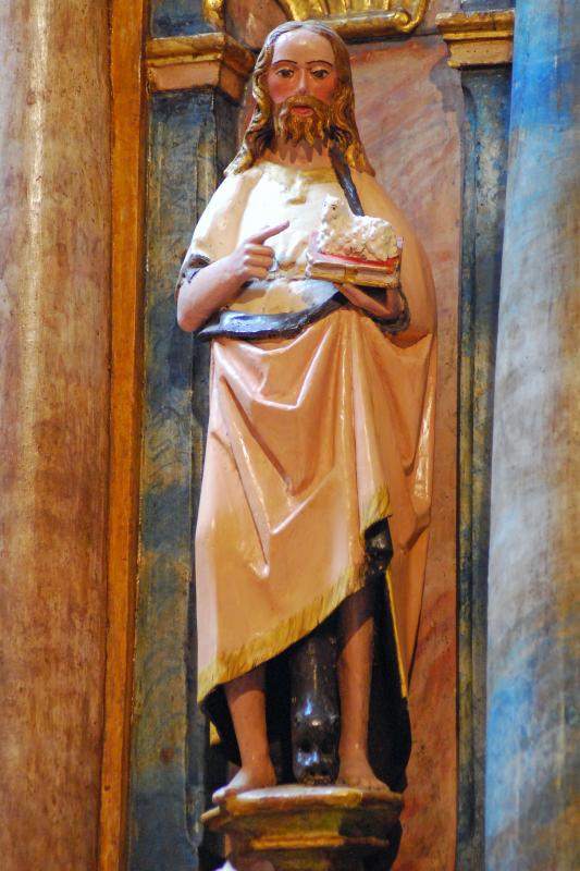Interesante talla del Precursor, quizá la más interesante del retablo mayor de San Clemente. Viste túnica que le llega hasta las rodillas y manto que cubre su hombro izquierdo y se recoge sobre su cintura ocultando parcialmente el resto del cuerpo. Su representación se atiene a los postulados más convencionales, portando sobre su mano izquierda un libro con el Agnus Dei , al que señala con el índice de mano diestra. Su rostro, de despejadas facciones, se enmarca por una melena de ondulantes mechones y una barba de remates filamentosos. Resta por señalarse la presencial del demonio tentador junto a sus piernas. Aunque se ha repintado por completo mantiene su carácter, incluso en el intento por aportar esa imagen de pelaje animal en el remate del manto.
