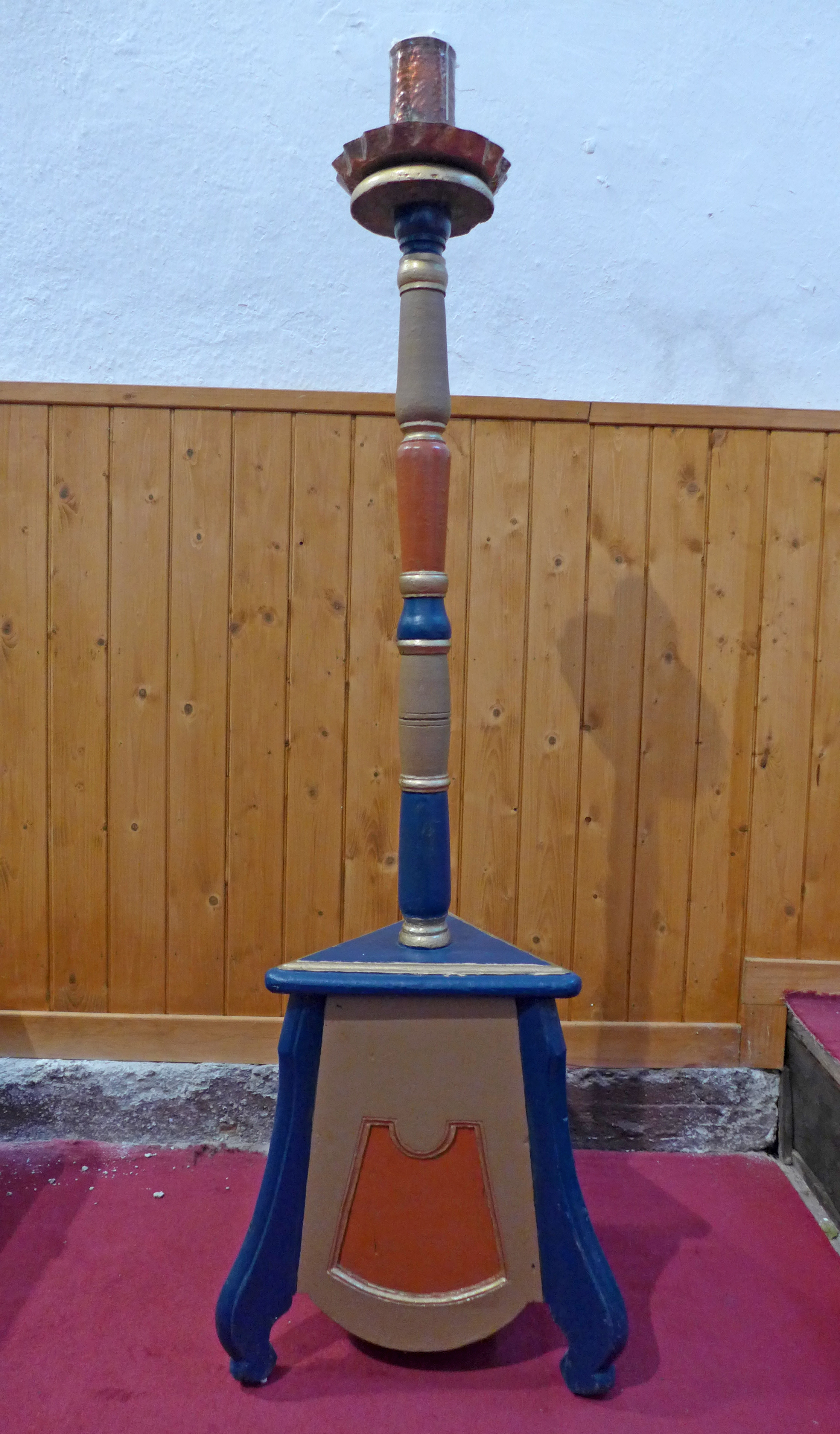Hachero de factura muy popular. Pie de base triangular con patas tornapunteadas y brazo torneado con molduras de distintos tamaños. Muestra una decoración de placas mixtilíneas en los laterales de la base.