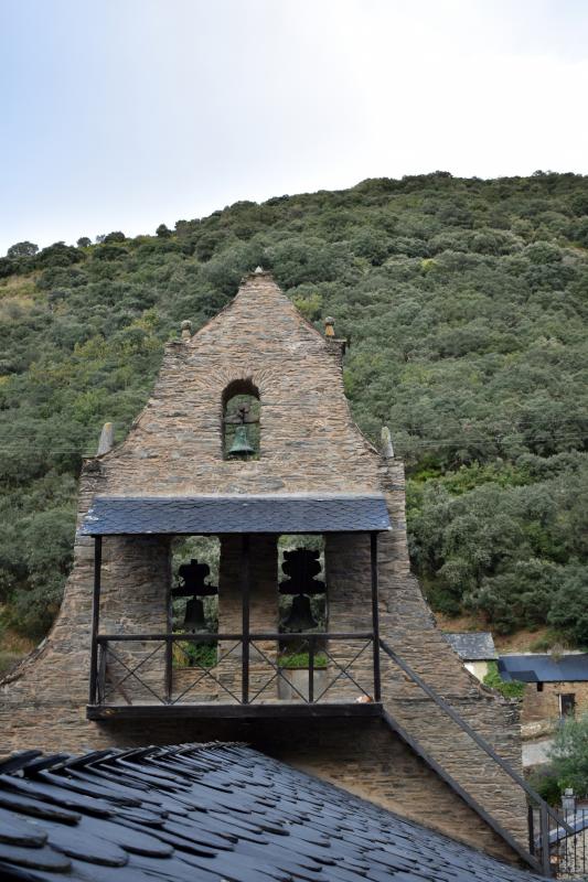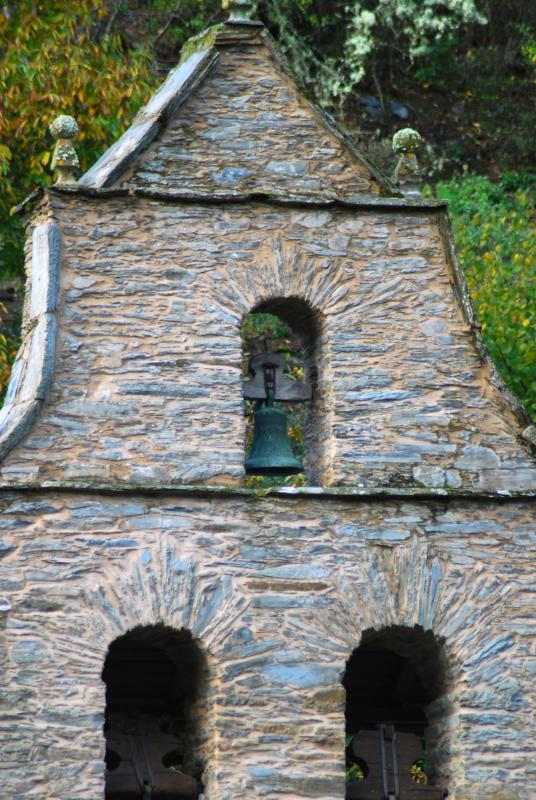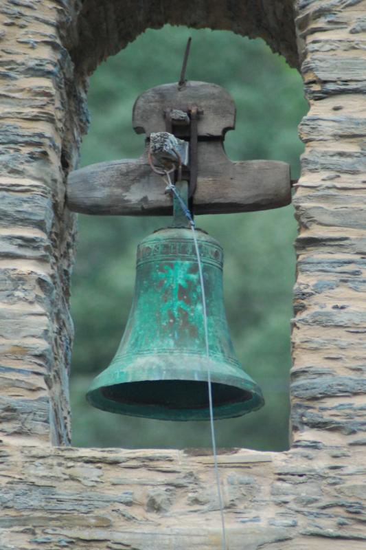 Campanillo de perfil esquilonado. Su tercio, que contiene la invocación -parcialmente ilegibles por su altura- y la fecha de su fundición, se enmarca por dos parejas de cordones. En el medio exhibe una cruz de calvario. Su pie se adorna con tres cordones. Conserva el badajo.