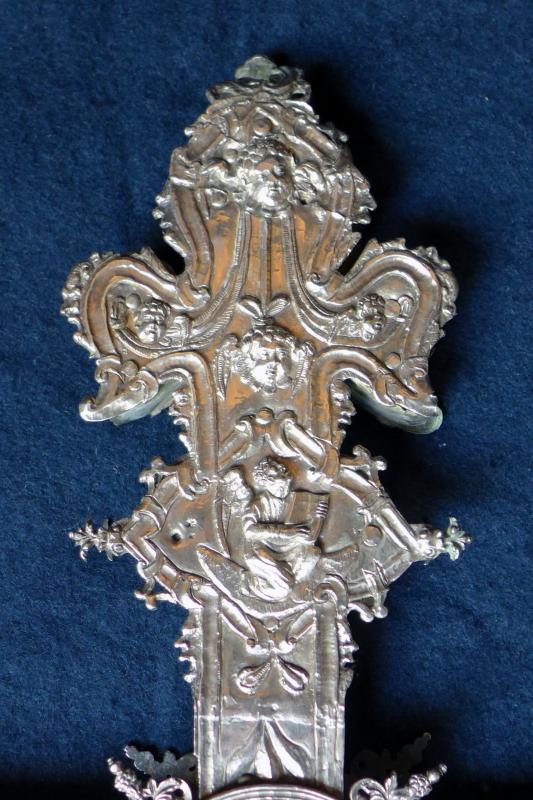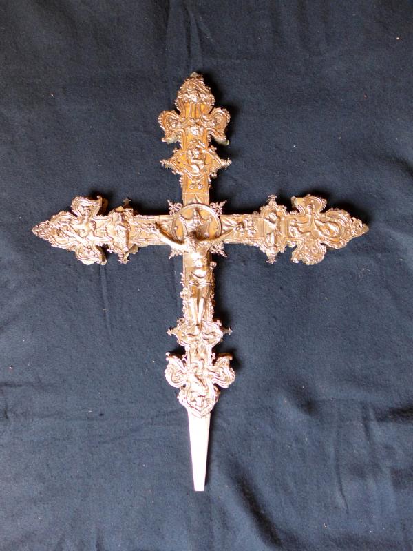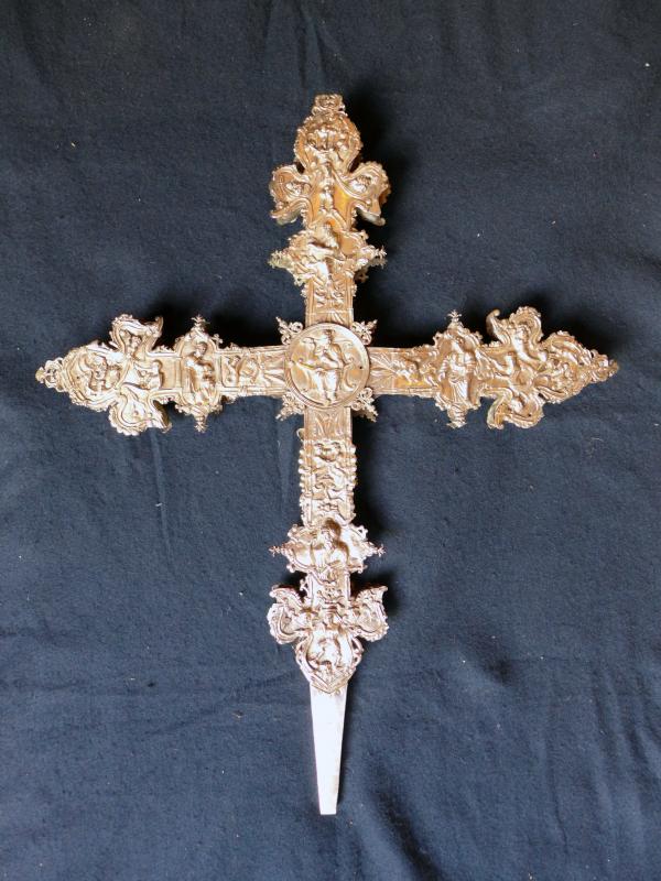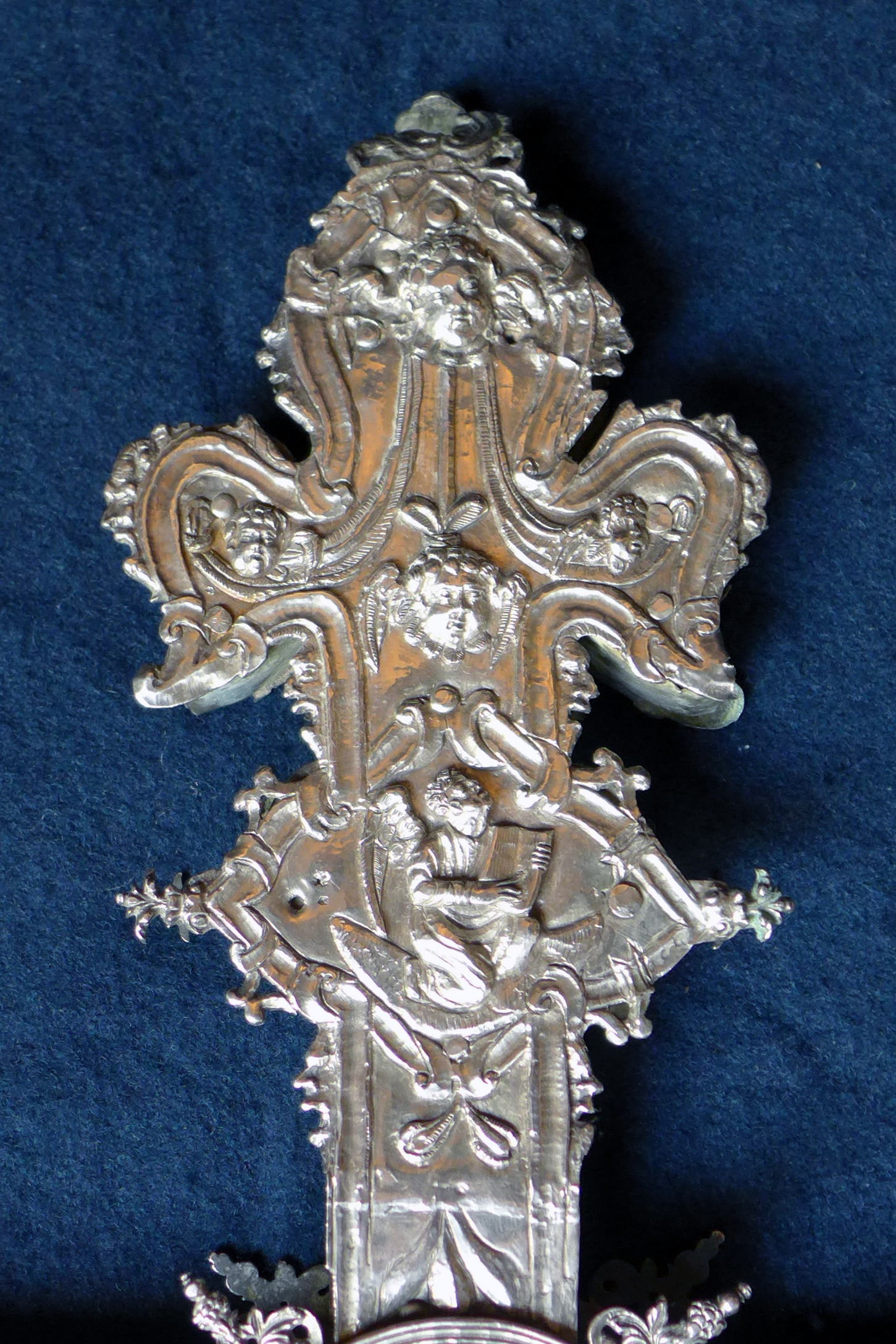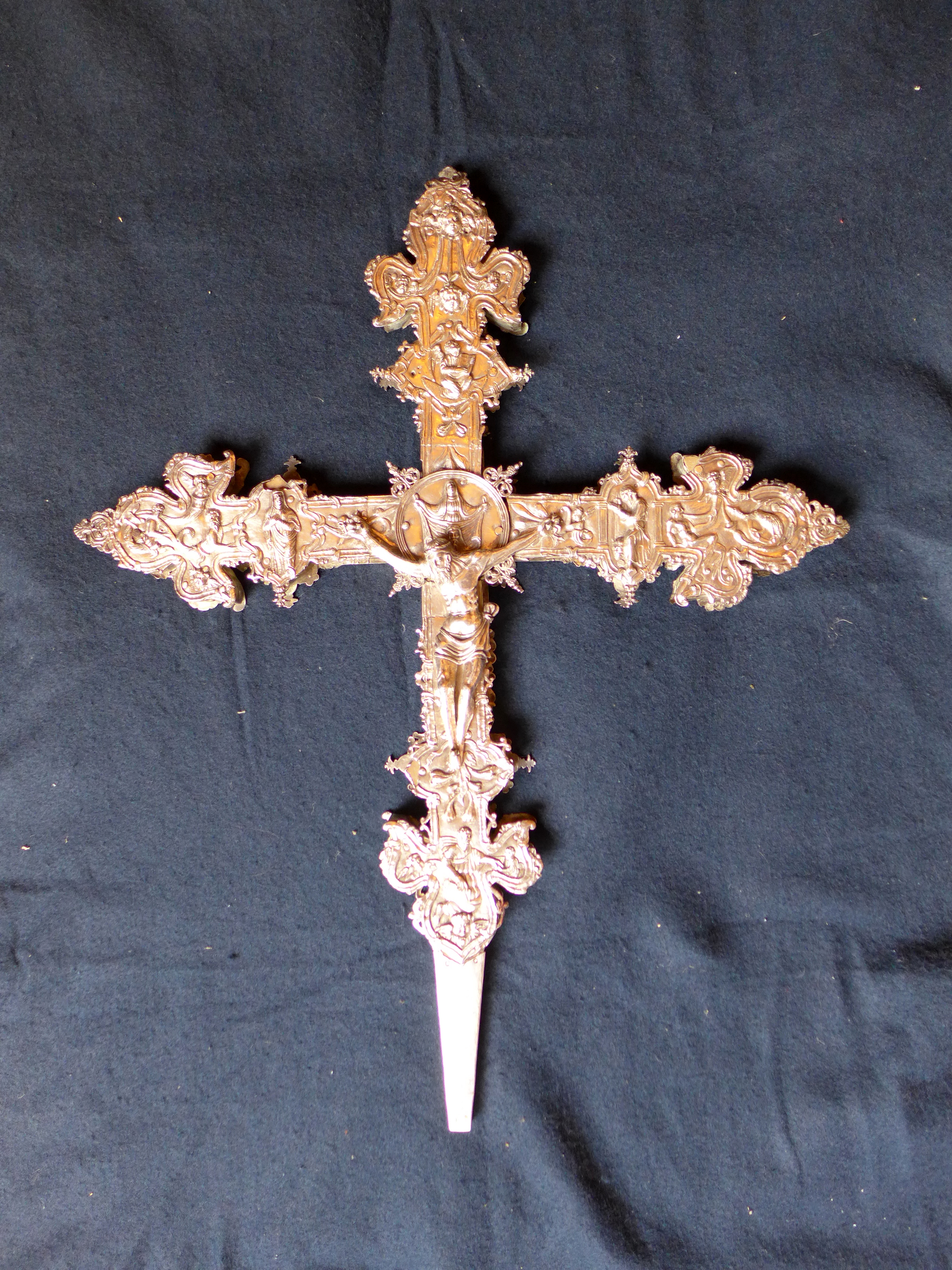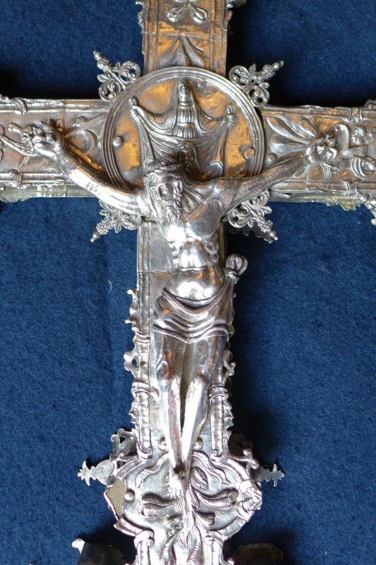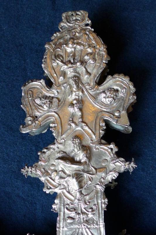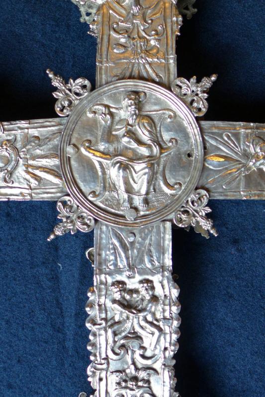 Cruz latina de brazos bastante cortos y remates flordelisados. En el anverso porta al Crucificado con imágenes de San Juan y la Virgen Dolorosa en las expansiones del brazo horizontal, de dos evangelistas en las del brazo vertical y de la Magdalena en el cuadrón central. En el reverso no hay imágenes de bulto y son todo relieves repujados de evangelistas, apóstoles y en el centro Dios Padre sentado en su trono. Entre todos ellos abunda la decoración menuda a base de tornapuntas, motivos fitomorfos y cabezas de angelitos.