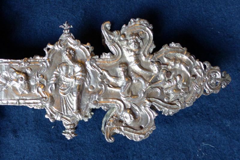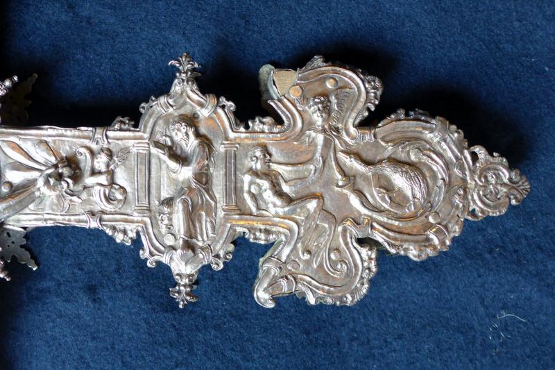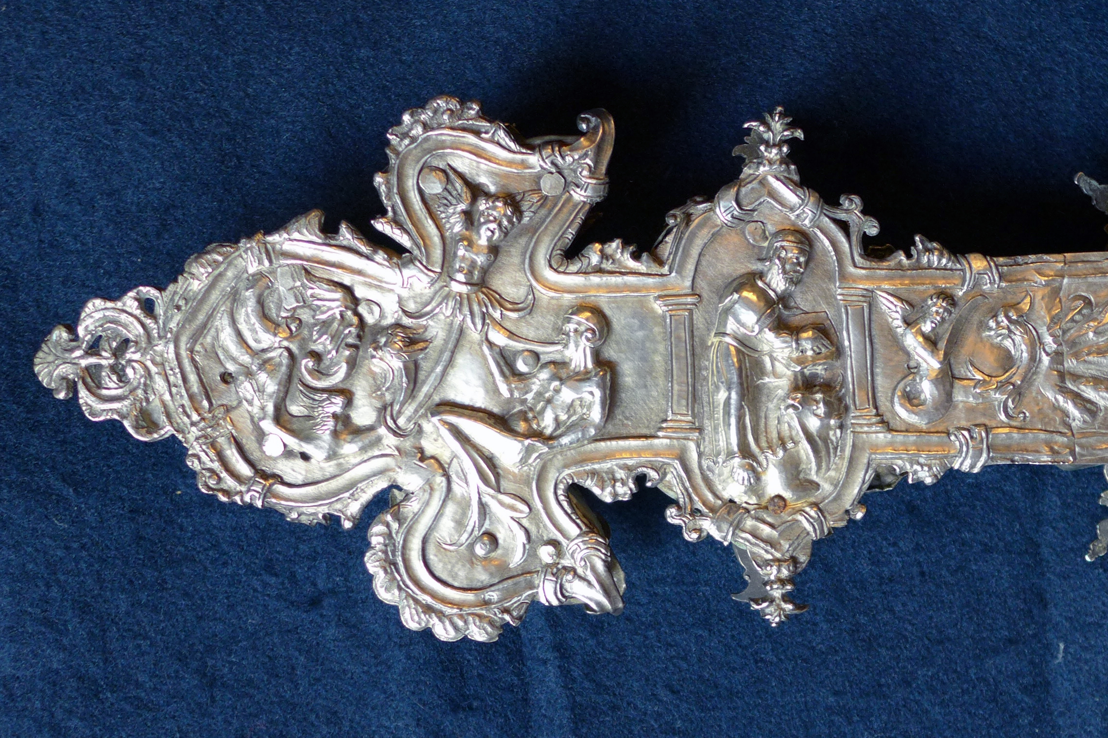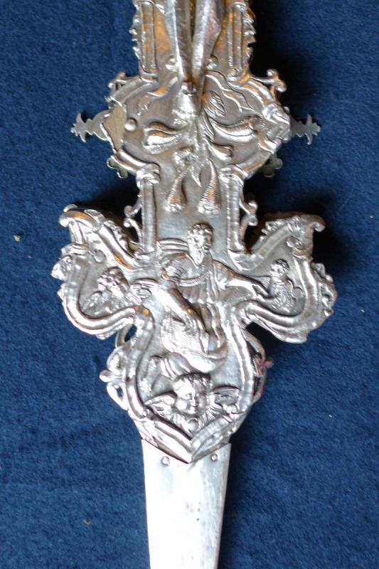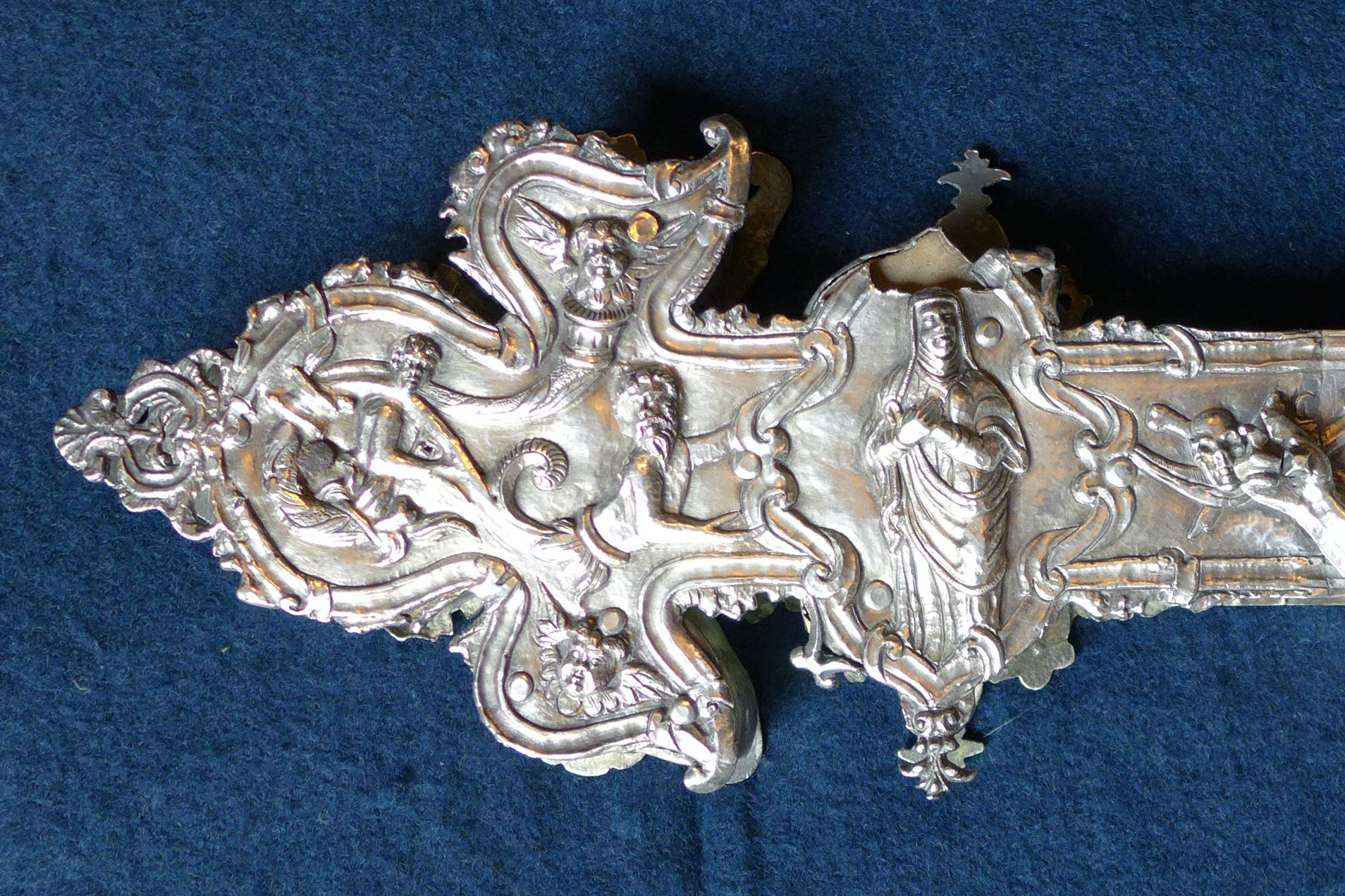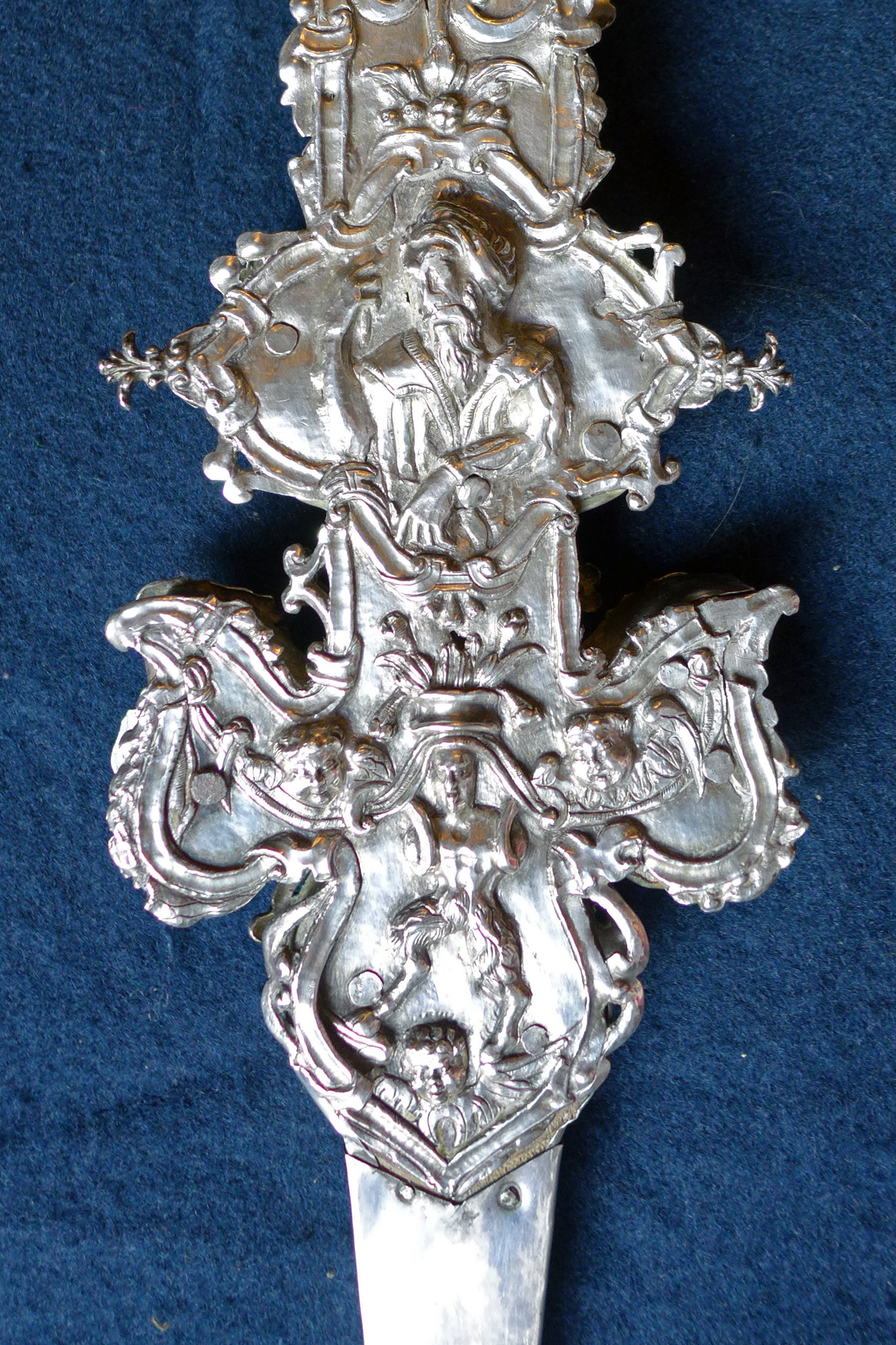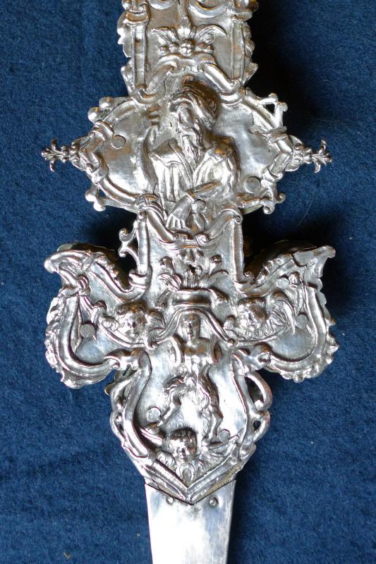 Cruz latina de brazos bastante cortos y remates flordelisados. En el anverso porta al Crucificado con imágenes de San Juan y la Virgen Dolorosa en las expansiones del brazo horizontal, de dos evangelistas en las del brazo vertical y de la Magdalena en el cuadrón central. En el reverso no hay imágenes de bulto y son todo relieves repujados de evangelistas, apóstoles y en el centro Dios Padre sentado en su trono. Entre todos ellos abunda la decoración menuda a base de tornapuntas, motivos fitomorfos y cabezas de angelitos.