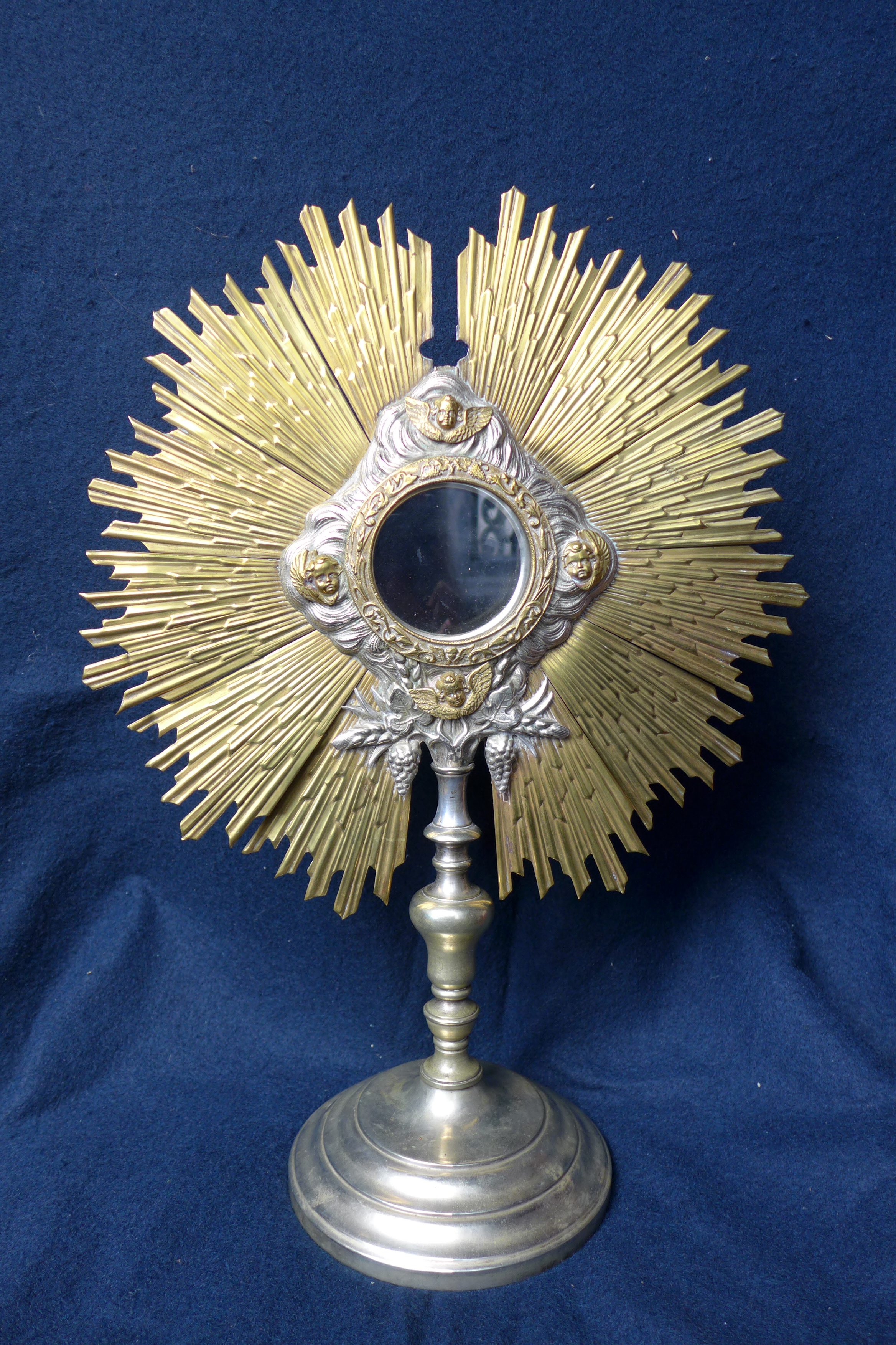 Custodia portátil o de tipo ostensorio. Se compone de un pie circular abullonado y de un astil torneado con nudo perifome. El ostensorio adopta forma circular con una Gloria rodeada de querubes y un resplandor de rayos dorados, biselados y asimétricos. Ha perdido la cruz que remataría el conjunto