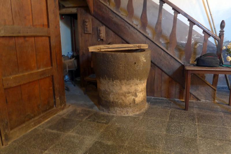 Pila bautismal monolítica sin pie diferenciado. Su vaso, ahuecado de manera cóncava, va cubierto con tapa de moderna factura.