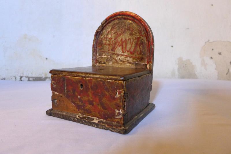 Caja prismática de base cuadrangular, pestaña inferior saliente y tapa abatible. En su parte trasera exhibe respaldo en forma de arco de medio punto con borde moldurado. Su popular policromía a base de jaspeados se combina con las inscripciones en letra roja que se muestran en el frente de su respaldo.