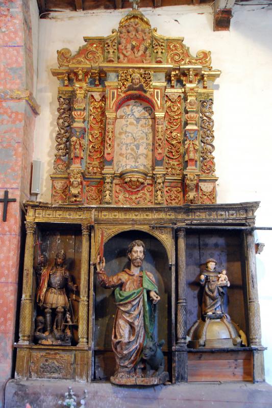 Retablo lateral compuesto de dos cuerpos realizados en distinta época. El inferior se articula en banco y tres calles separadas por columnas clásicas de fuste acanalado y tercio inferior entorchado. En el basamento se conservan tres relieves sobre cartelas de cueros recortados con efigies de los Evangelistas (uno de ellos se ha perdido). En cada una de la calles se ubican imágenes de bulto de distinta época, tamaño y factura. De izquierda a derecha: San Miguel arcángel, San Bartolomé y San Antonio de Padua. Este cuerpo se separa del superior mediante un entablamento profusamente moldurado y ornado con puntas de diamante. El cuerpo superior, barroco, consta de una hornacina central flanqueada por estípites y una pulsera de trabajo calado a base de motivos vegetales. Se remata con un ático en el que aparece un relieve de las Ánimas en el Purgatorio flanqueado por sendos aletones. El contraste entre ambos cuerpos resulta especialmente llamativo al combina la sobriedad del primero con la exhuberancia del segundo. Este último se muestra próximo a algunos de los retablos de la iglesia de San Pedro de Montes de Valdueza.