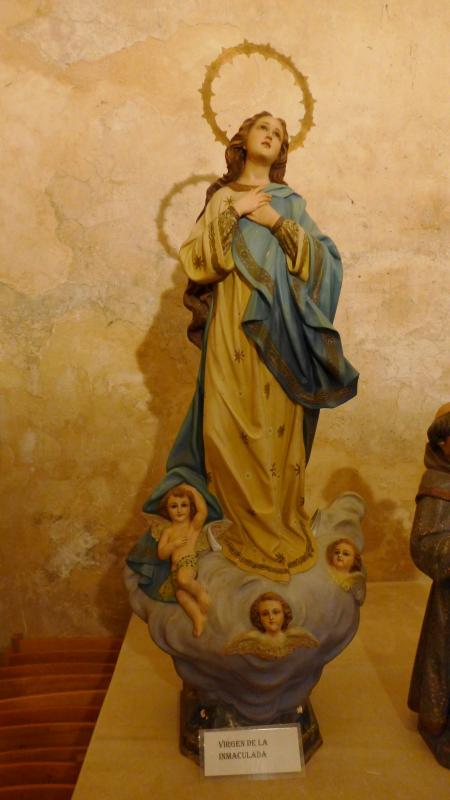 Imagen de escayola policromada que representa a una Virgen casi niña con el pelo suelto, arrobada y con la mirada hacia arriba, manos cruzadas sobre el pecho, ascendiendo entre un nubaje sobre peana que acoge a un angelito entero y dos cabezas aladas de serafines. Viste vestido blanco tachonado de estrellas y manto azul y porta nimbo metálico de estrellas.