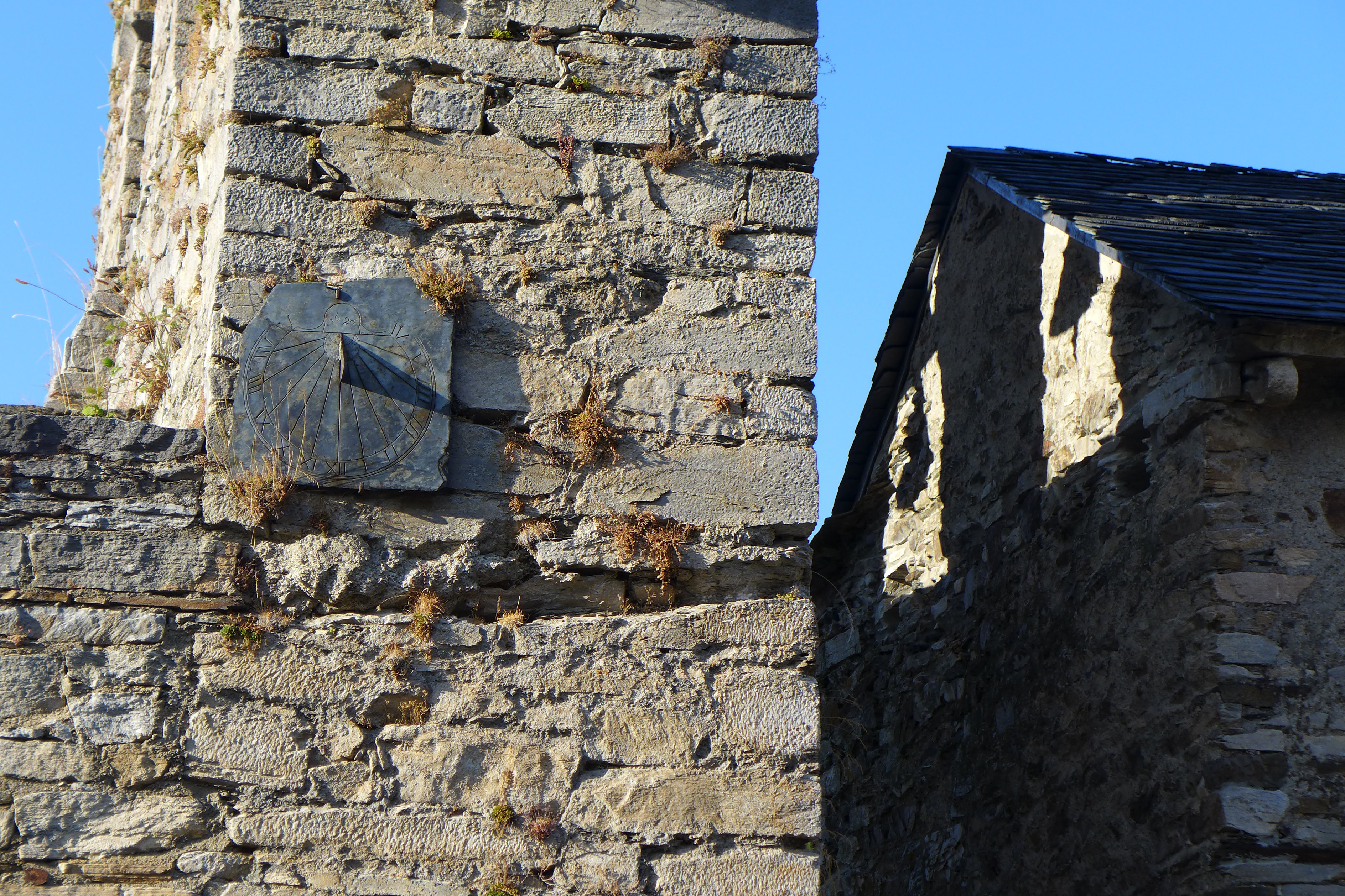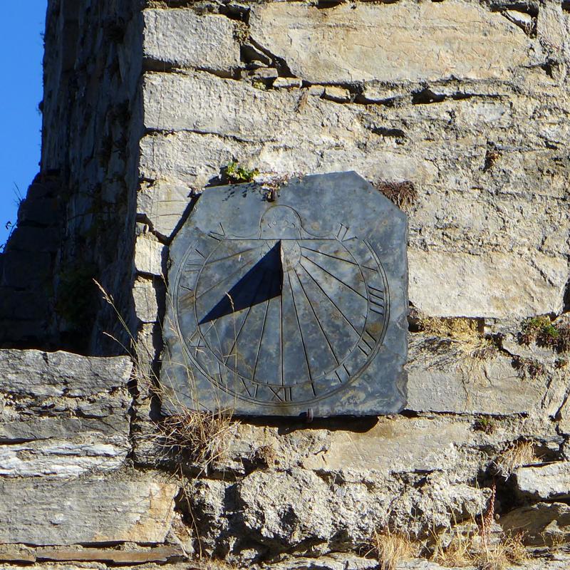 Reloj circular cortado por una recta secante en su parte superior. Realizado sobre una laja de pizarra cuadrada, conserva gnomon metálico (una chapa metálica triangular). Recorta sus dos esquinas superiores y se sujeta con tres anclajes metálicos, dos en su parte inferior y uno arriba. Traza vertical a mediodía y presenta las horas en números romanos de VI de la mañana a VI de la tarde, con indicación de las medias horas mediante pequeñas marcas. La serie de números se lee desde el interior, si bien en su mitad izquierda (según se mira) los números VI, VII, VIII y IX se presentan invertidos.