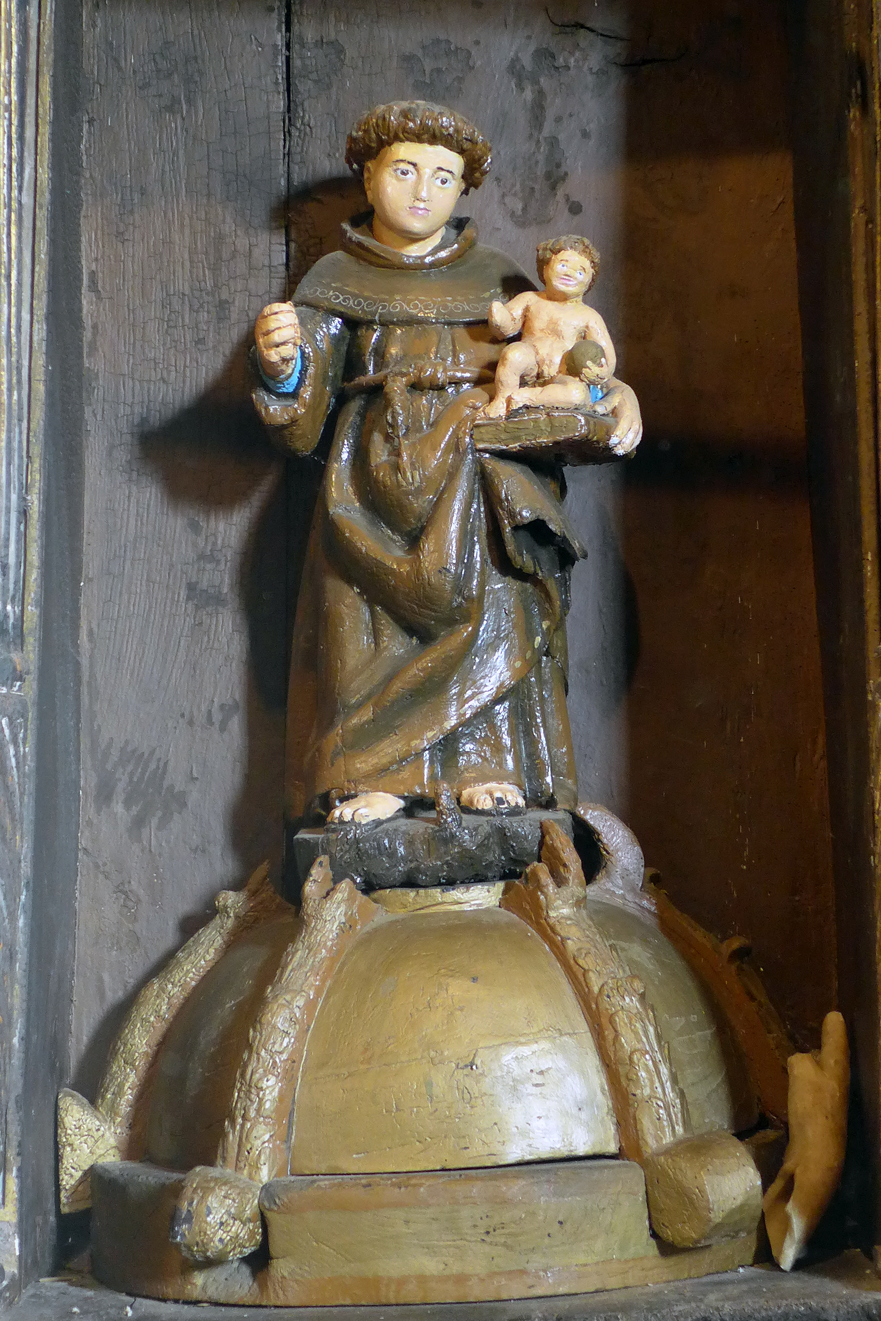 Escultura de bulto redondo del santo de Padua. Se representa conforme a su iconografía más habitual, en pie, vestido con hábito franciscano ceñido a la cintura, y con el libro el Niño Jesús sobre su mano izquierda. Su mano derecha, en alto, pudo llevar algún otro atributo. Respecto al tratamiento de los rostros, anatomías y paños resulta bastante dispar. Los primeros son bastante anodinos, los segundos están bien resueltos, con abundantes plegados de aspecto duro y metálico. La talla va sobre una pequeña peana, aunque se le ha añadido una especie de cascarón bajo ella, seguramente para igualar su altura respecto al resto de esculturas del retablo.