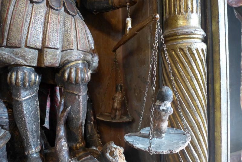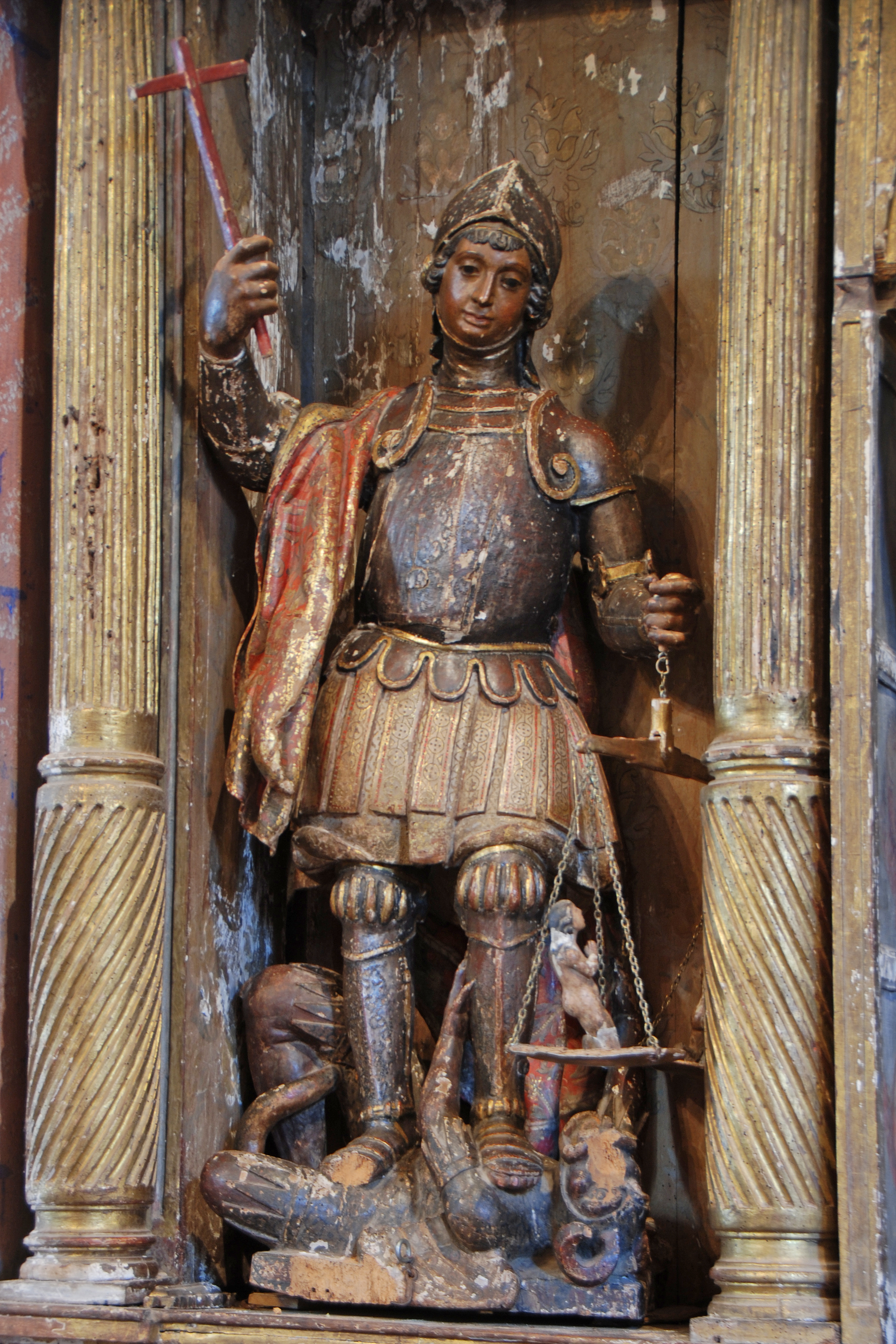 Escultura del arcángel San Miguel vestido como celestial soldado que vence al demonio. Así, porta armadura completa y yelmo pero, además, sobre su hombro derecho cuelga una capa roja y dorada con estofaduras. En la mano derecha sujeta una balanza con dos almas, representando así su faceta como psicopompo. En la diestra hoy sujeta en una cruz, pero en origen sería una lanza para abatir al demonio que yace tumbado a sus pies. Es una talla de cierta calidad y bien resulta en todos los sentidos.