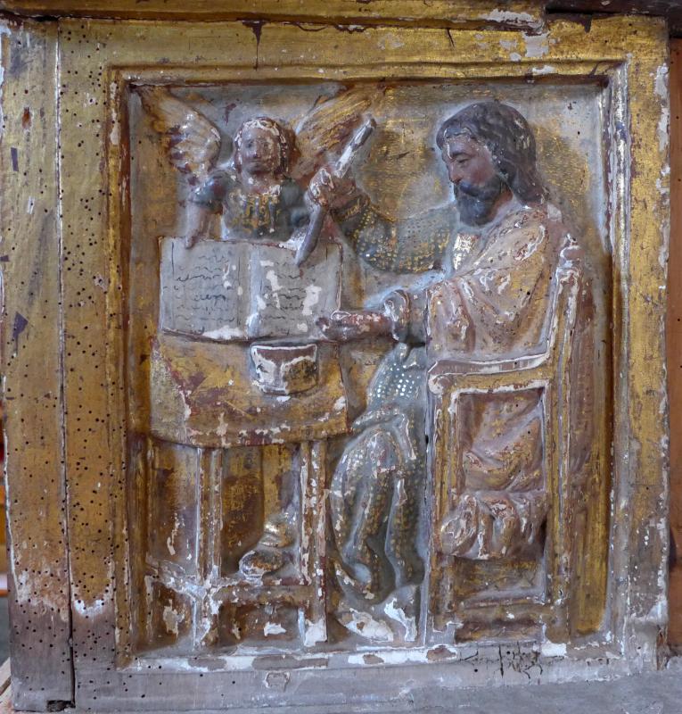 Relieve del evangelista San Mateo. El santo va sentado en un sillón frailero y viste túnica y manto. Su rostro, de gesto circunspecto, luce larga barba y melena ondulada. Como San Lucas se presenta en actitud de escribir, aunque en este caso el libro va apoyado sobre un atril, en el que también hay un tintero. Acompaña al santo y le sujeta el libro un ángel, símbolo iconográfico del Tetramorfos.