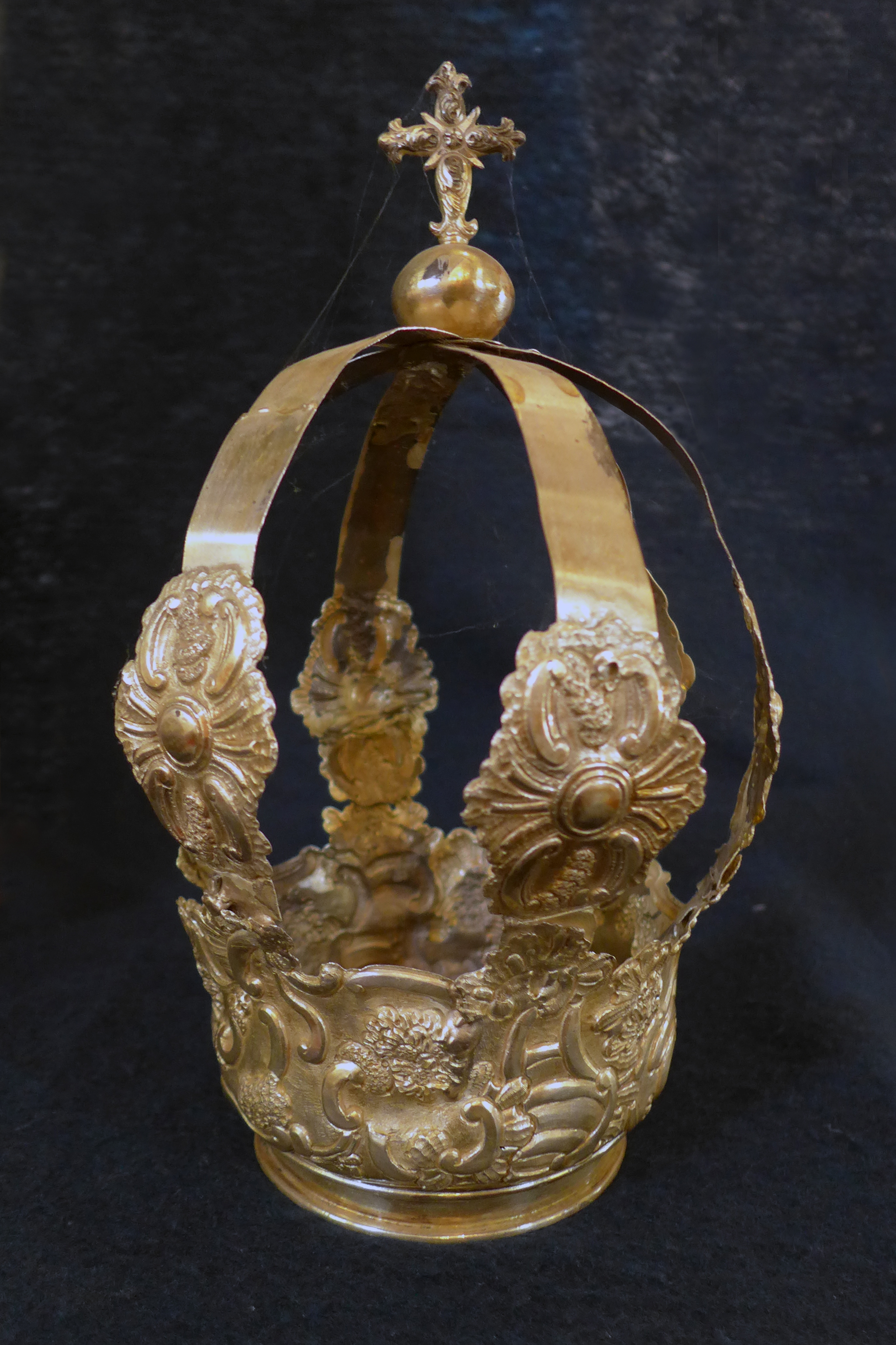 Corona real cerrada perteneciente a la Virgen del Rosario. Se compone de aro liso flanqueado por dos pestañas salientes, cuerpo bulboso de remate mixtilíneo y cuatro imperiales que se unen mediante orbe y cruz terminal. Imperan los motivos rococós a base de ces, tornapuntas, rocallas y elementos florales.