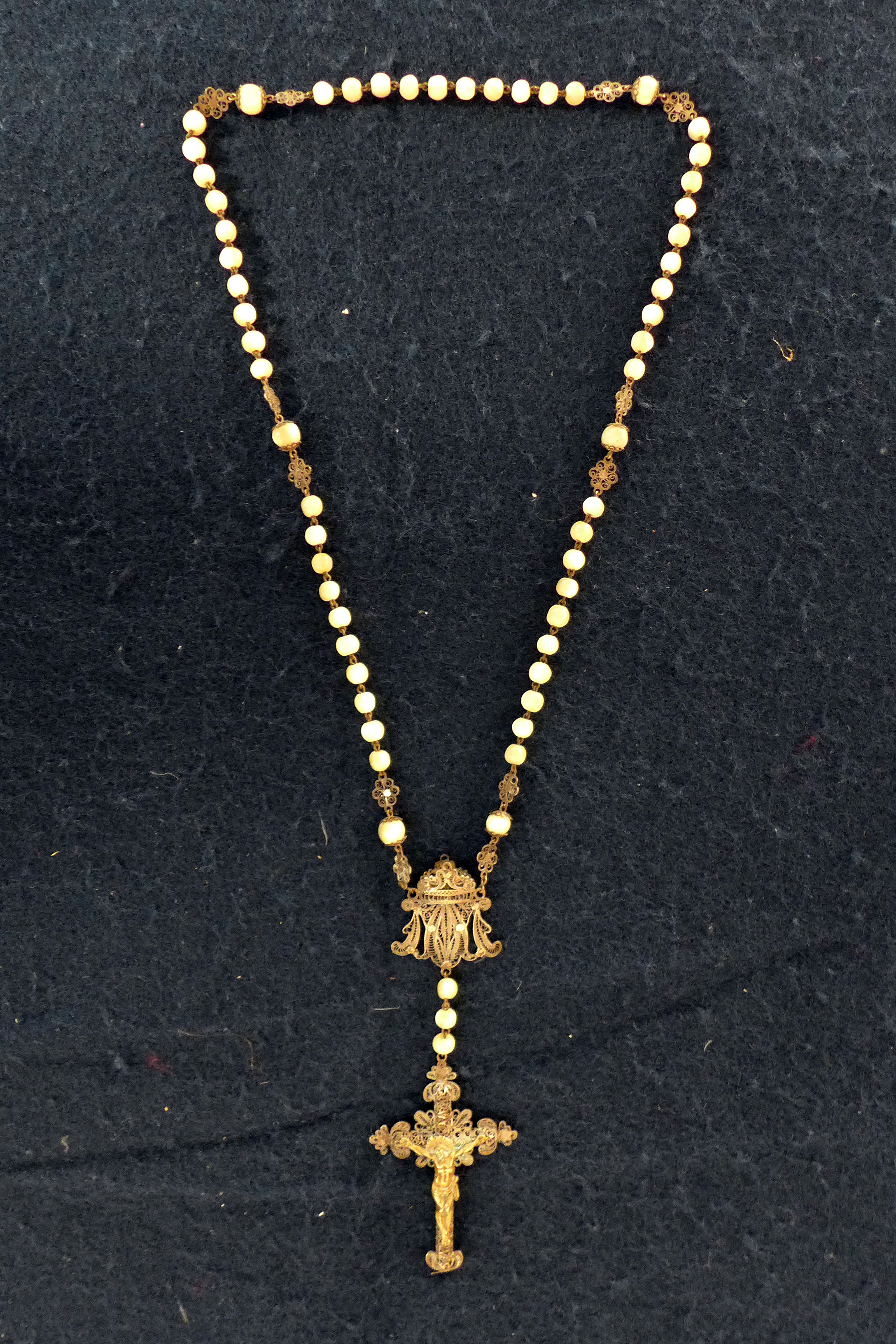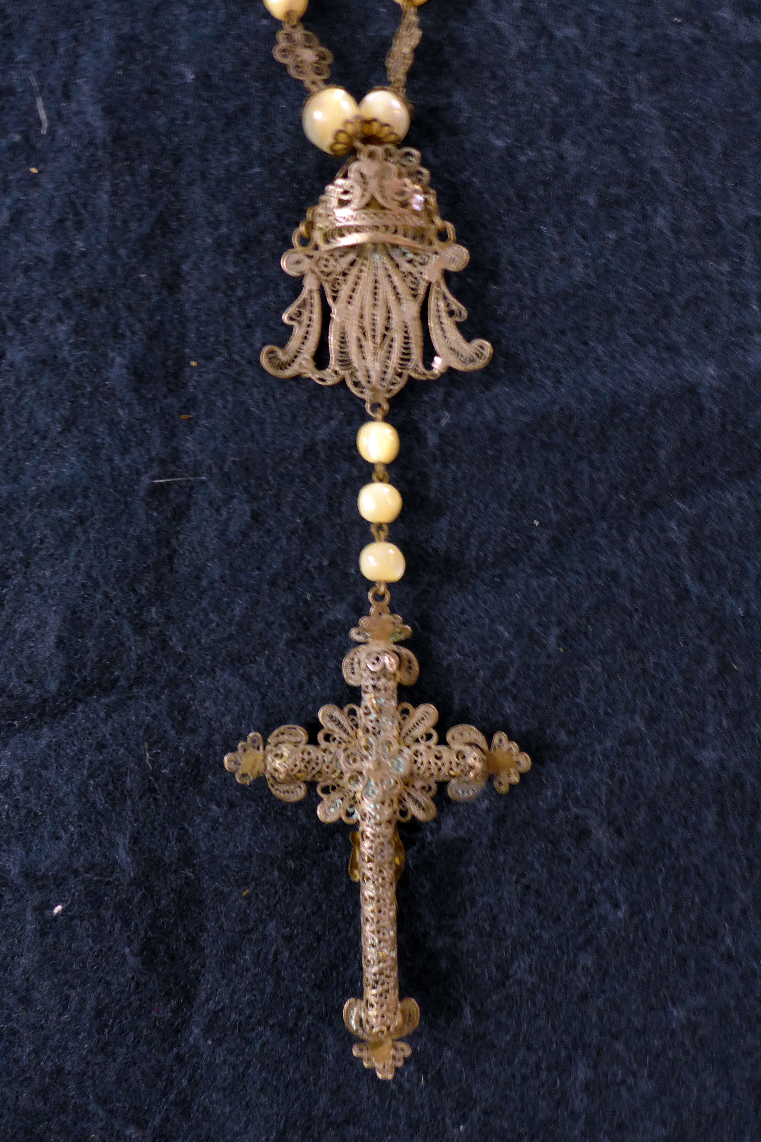 Rosario de pasta vítrea con misterios de filigrana de plata. En su parte inferior el Ave María recoge el anagrama mariano, realizado también en filigrana. La cruz de remate lleva crucificado de bulto, todo ello según modelos de cronología anterior.
