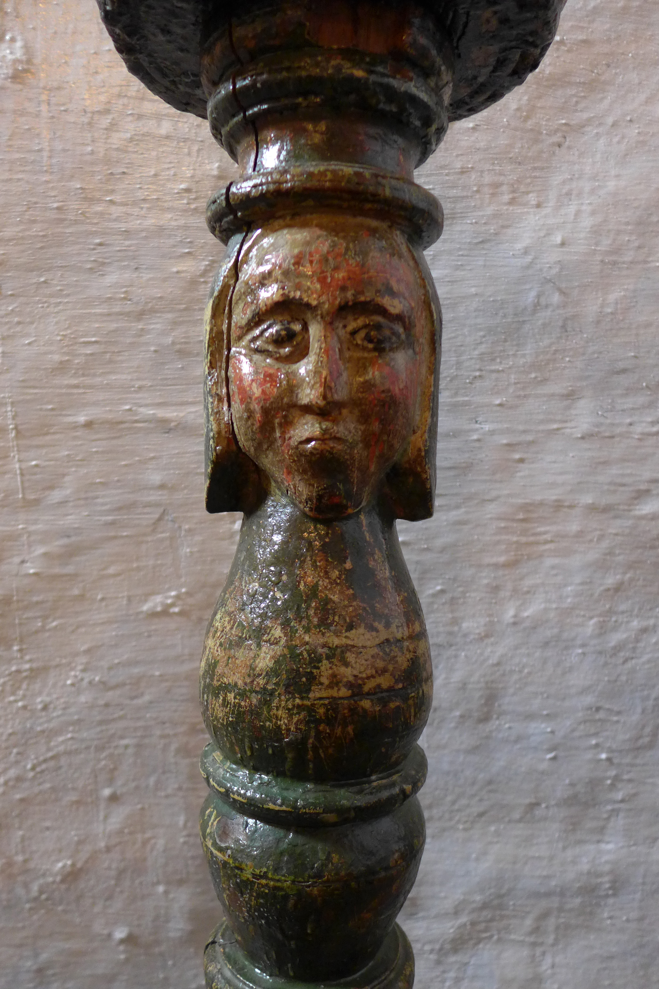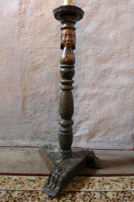 Hachero de vástago torneado y pie triangular con remates tornapunteados. La sucesión de molduras cóncavo-convexas de distinto tamaño se interrumpe por un inexpresivo rostro femenino con mejillas sonrosadas y melena corta. Se encuentra parcialmente repintado.