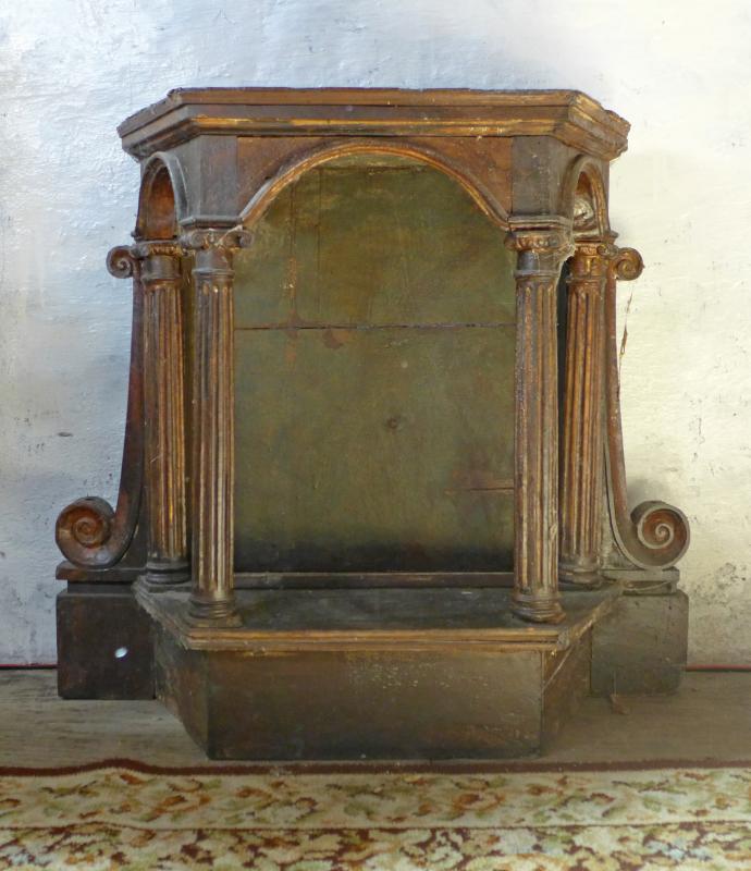 Templete prismático que quizá formó parte de un retablo, aunque hoy se encuentra totalmente descontextualizado. Tiene forma prismática con basamento liso, cuerpo central sostenido por columnas estriadas de cesta jónica que rematan en tres arcos ligeramente rebajados. Cierra en cornisa moldurada lisa. De los laterales de su respaldo emergen dos volutas a modo de aletones.